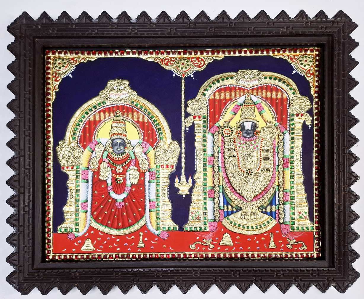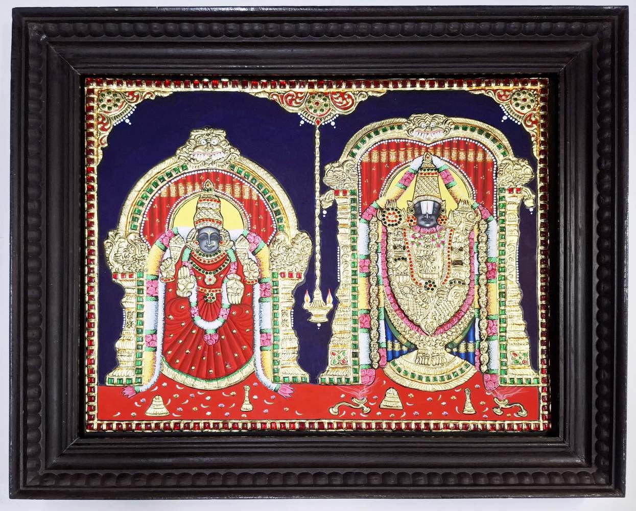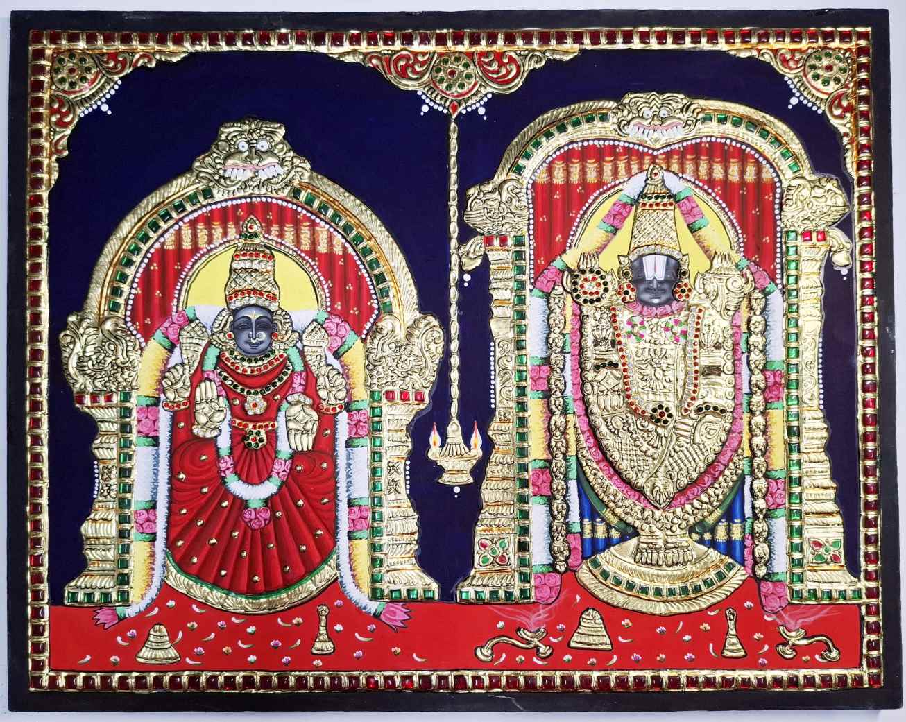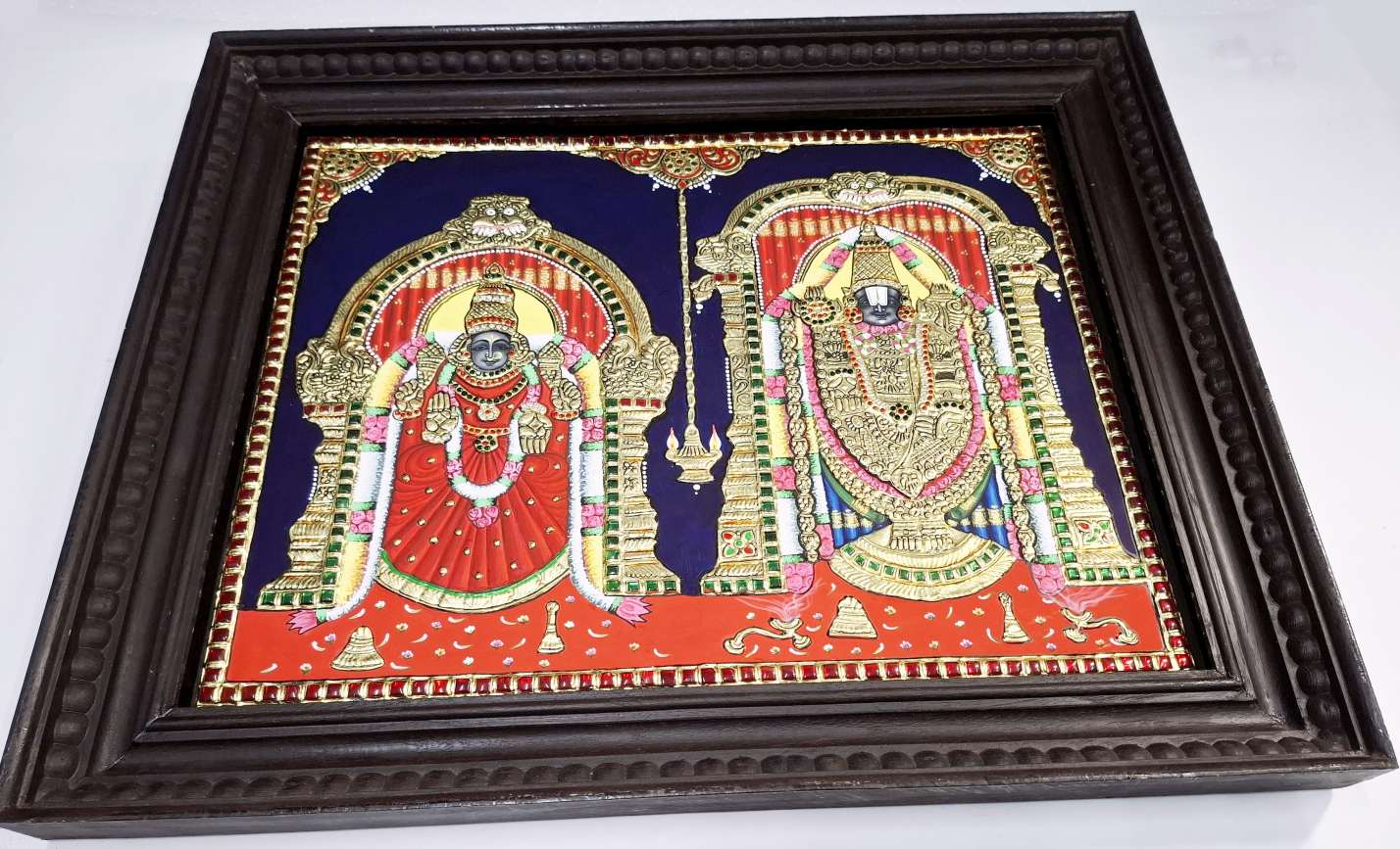 Hand-painted Tanjore painting of Lord Balaji & Goddess Padmavathi, crafted with 22K real gold foil and gemstones.
