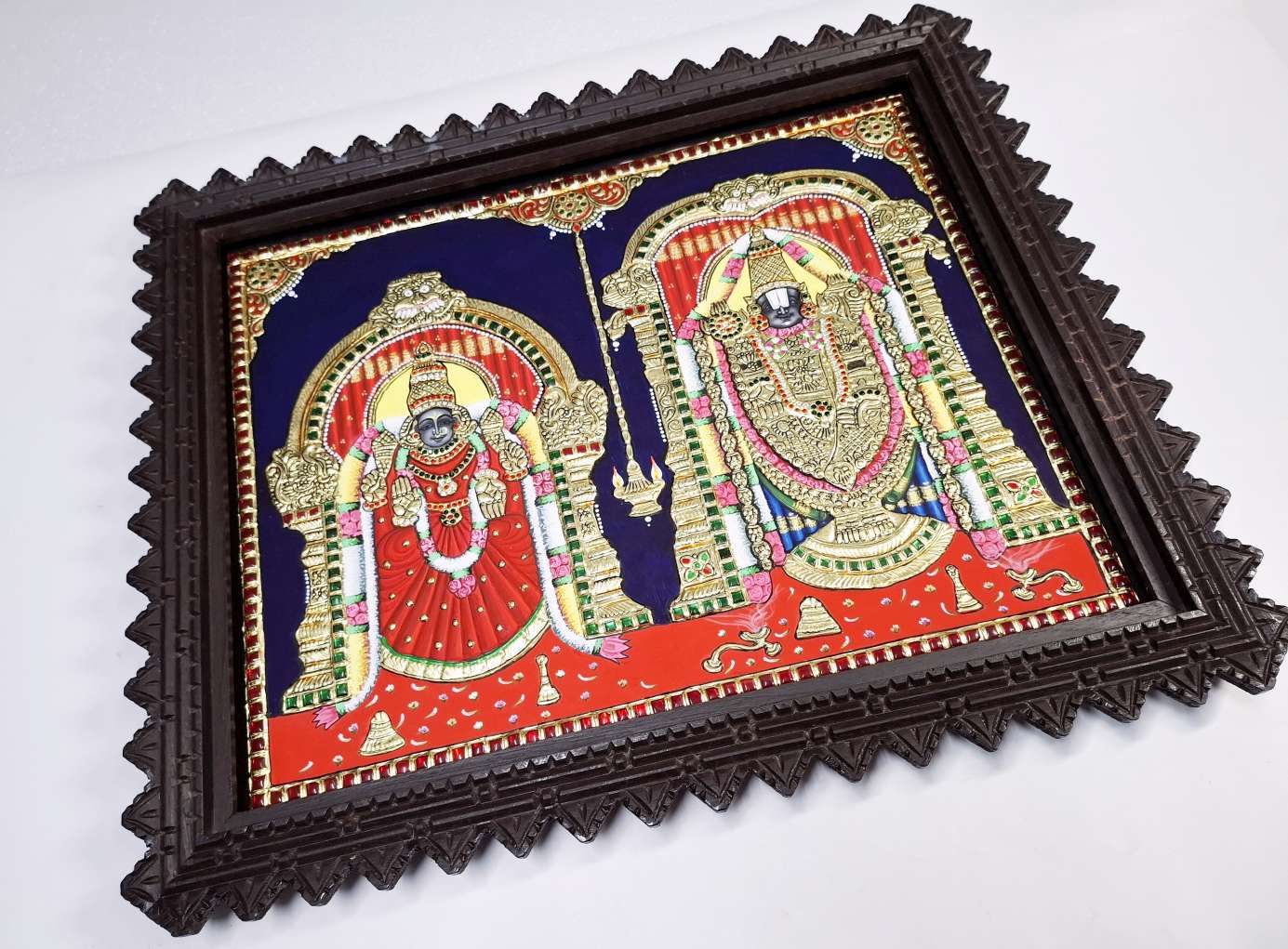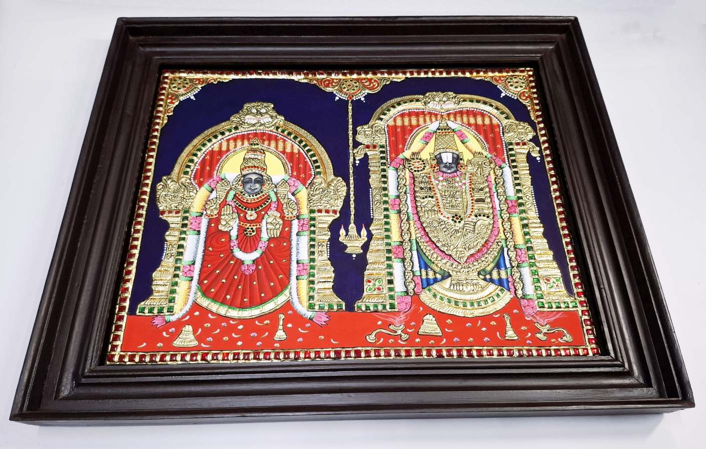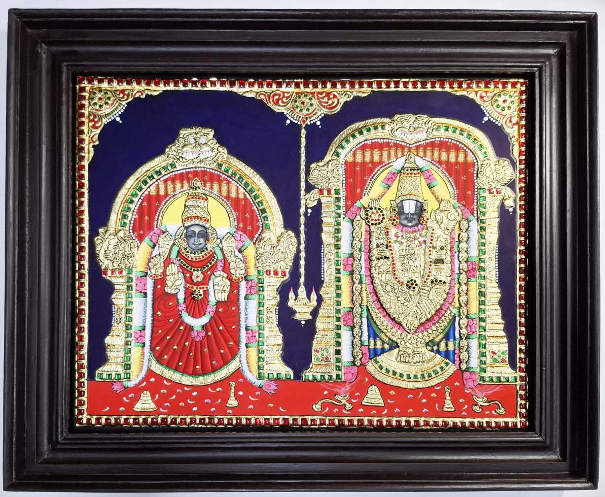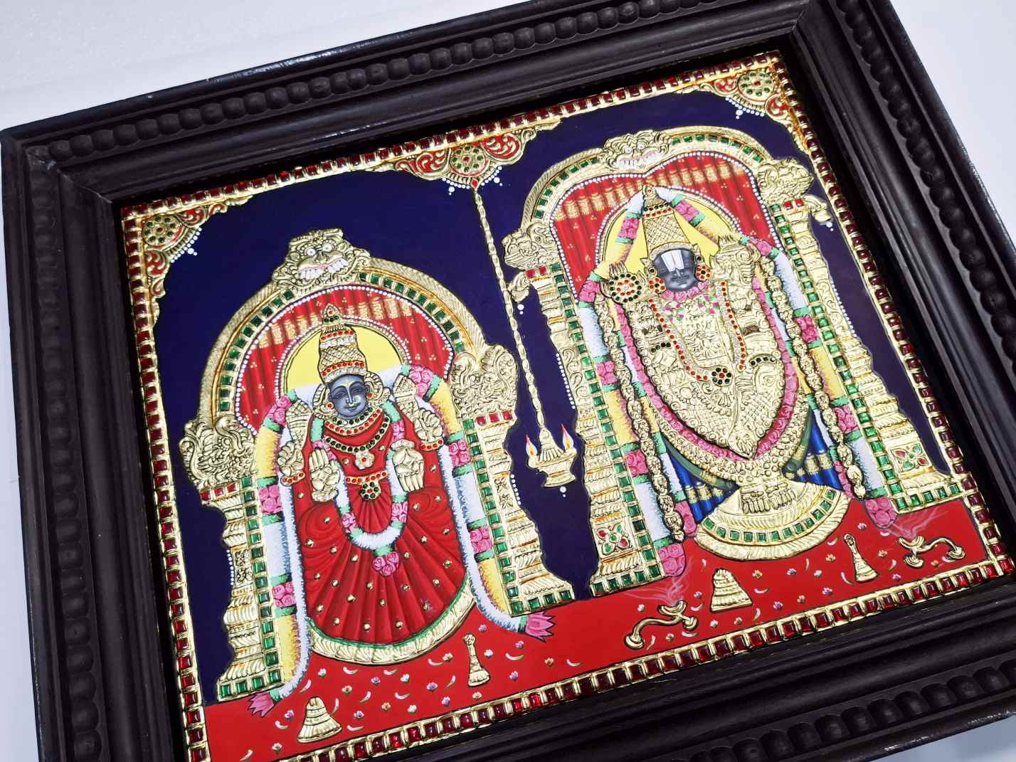 Hand-painted Tanjore painting of Lord Balaji & Goddess Padmavathi, crafted with 22K real gold foil and gemstones.