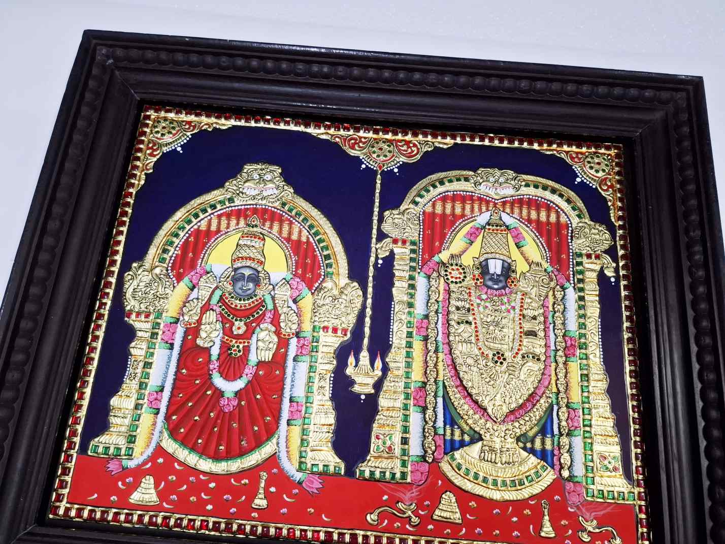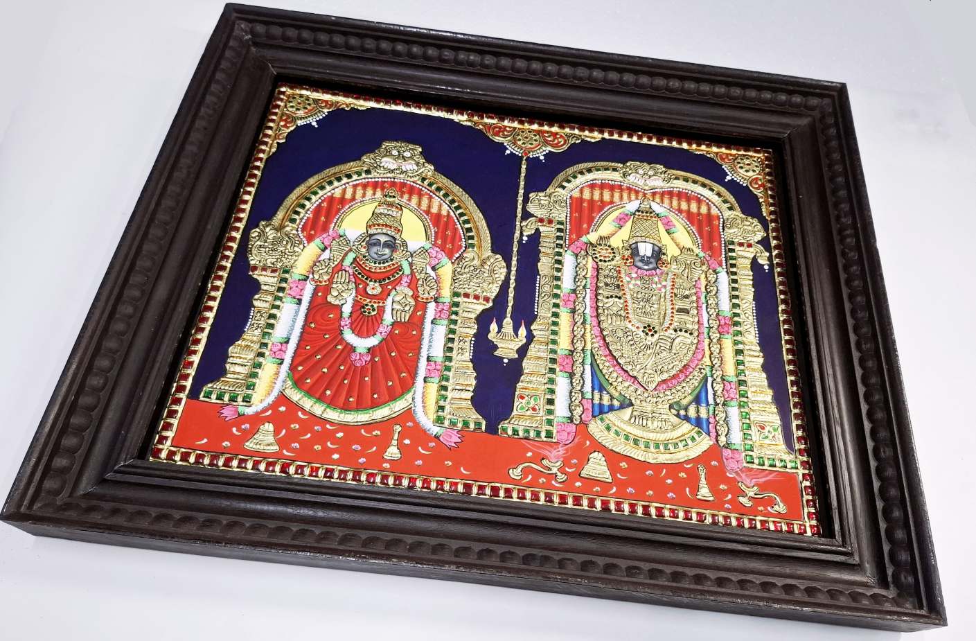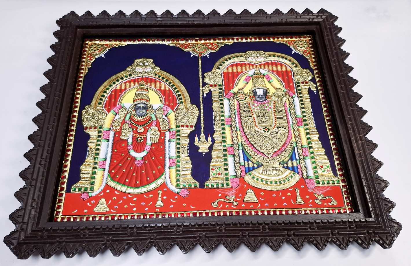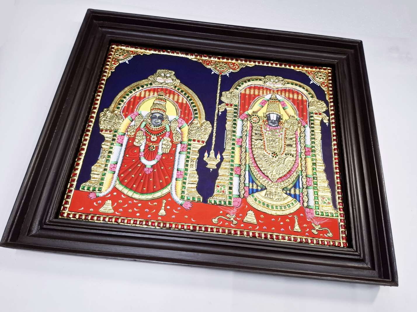 Hand-painted Tanjore painting of Lord Balaji & Goddess Padmavathi, crafted with 22K real gold foil and gemstones.