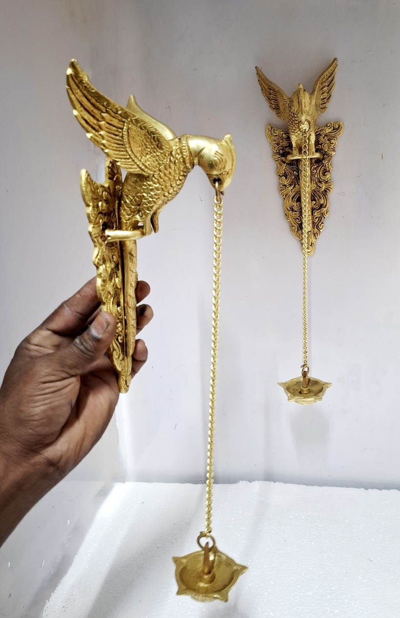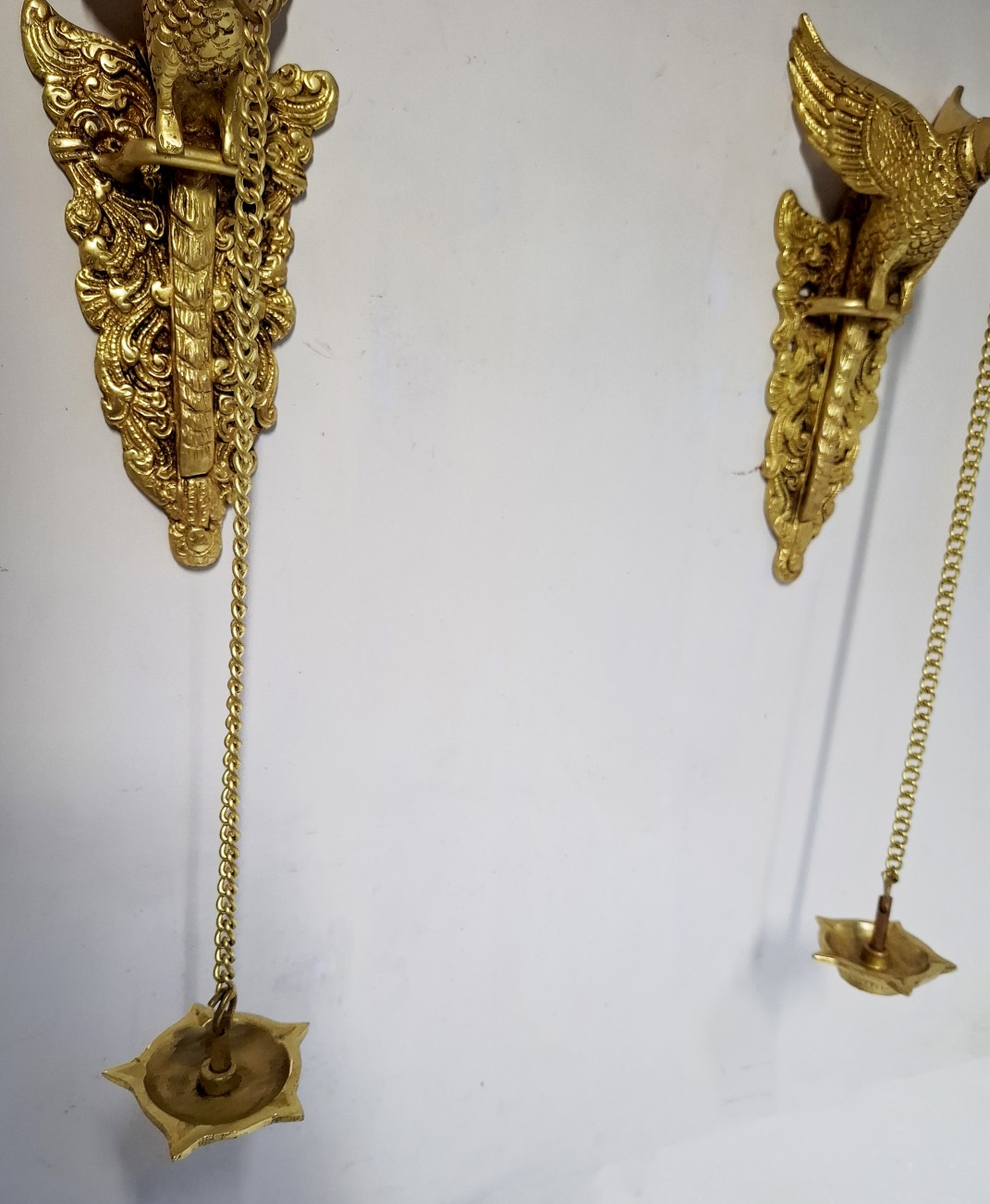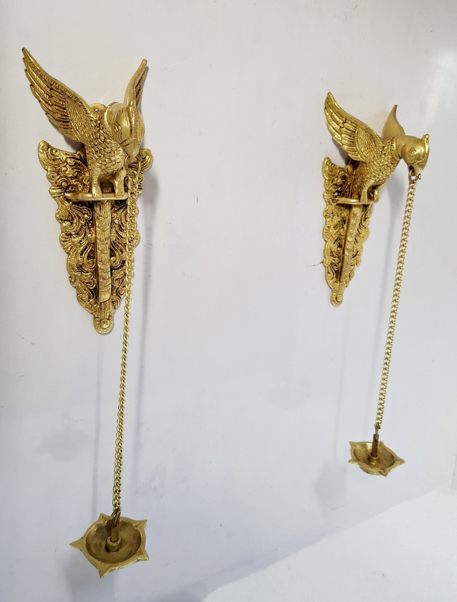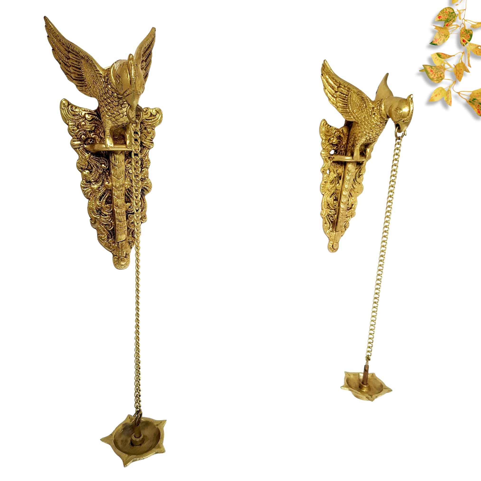 Each bracket features a beautifully sculpted brass parrot with spread wings, symbolizing prosperity and positivity. A hanging brass diya (oil lamp) is attached with a sturdy chain, making it perfect for creating a warm and welcoming ambiance in pooja rooms, entrances, living spaces, or meditation corners.