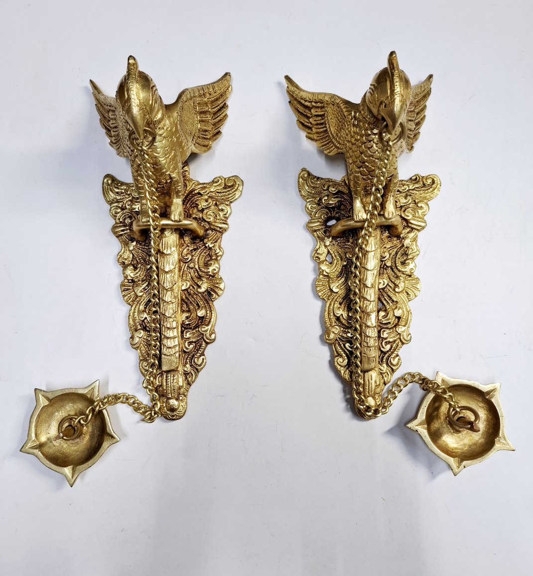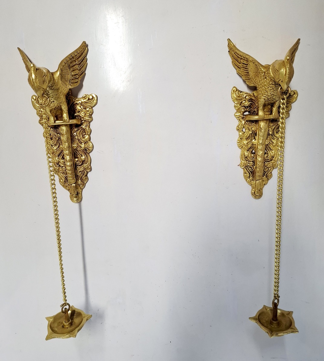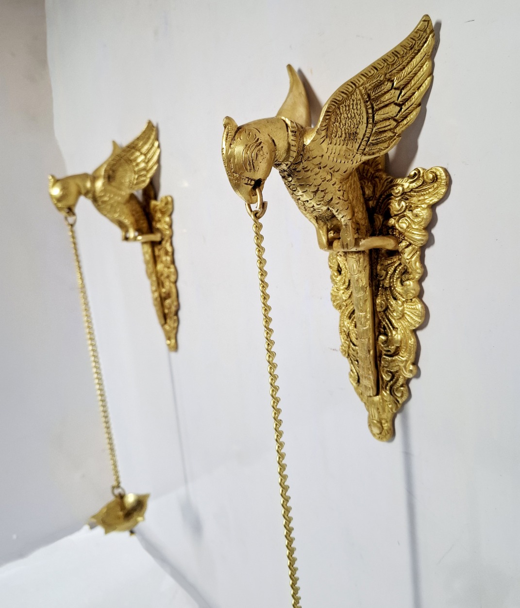 Each bracket features a beautifully sculpted brass parrot with spread wings, symbolizing prosperity and positivity. A hanging brass diya (oil lamp) is attached with a sturdy chain, making it perfect for creating a warm and welcoming ambiance in pooja rooms, entrances, living spaces, or meditation corners.