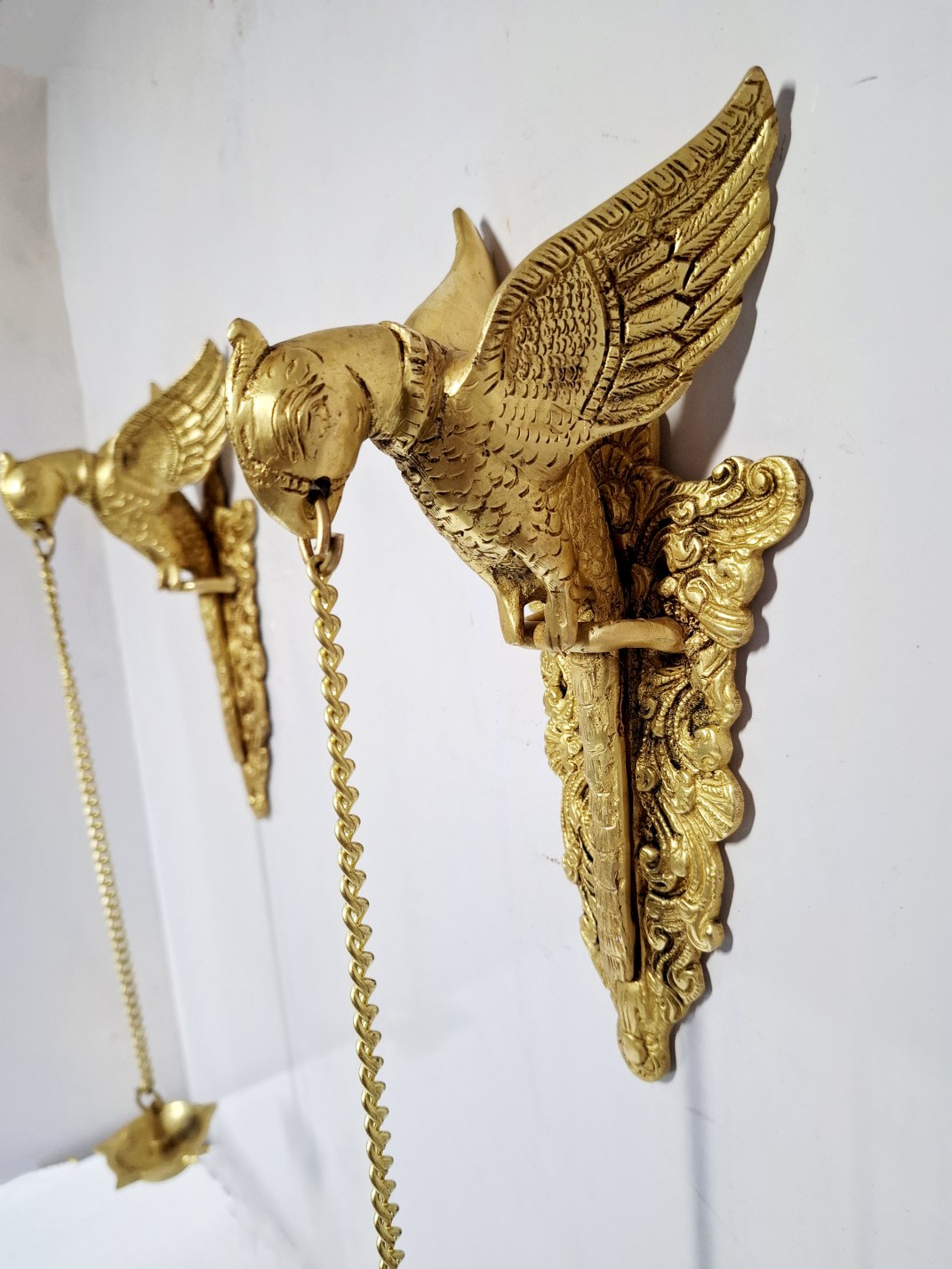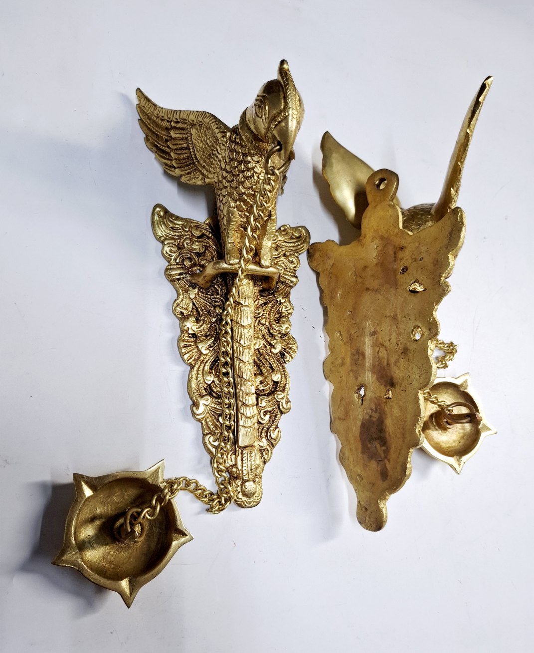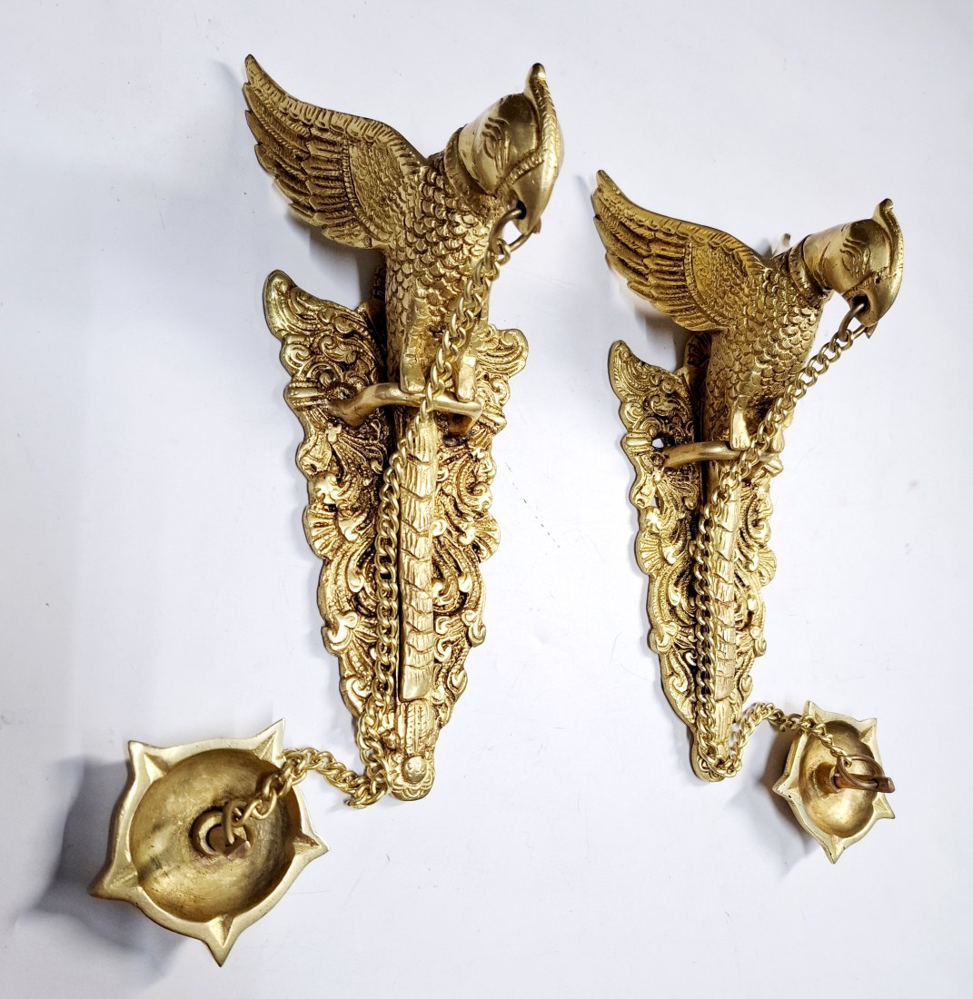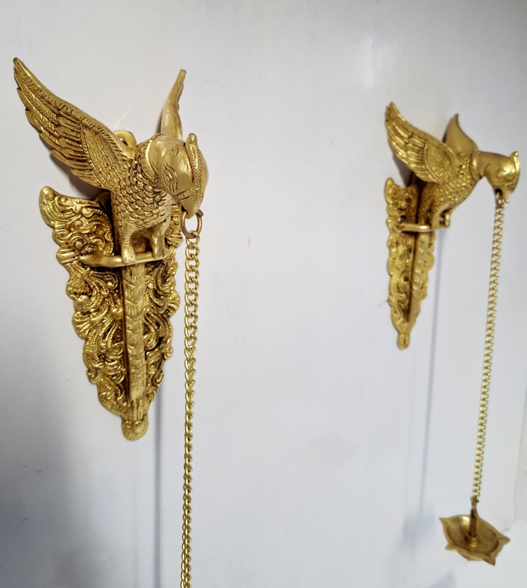 Each bracket features a beautifully sculpted brass parrot with spread wings, symbolizing prosperity and positivity. A hanging brass diya (oil lamp) is attached with a sturdy chain, making it perfect for creating a warm and welcoming ambiance in pooja rooms, entrances, living spaces, or meditation corners.