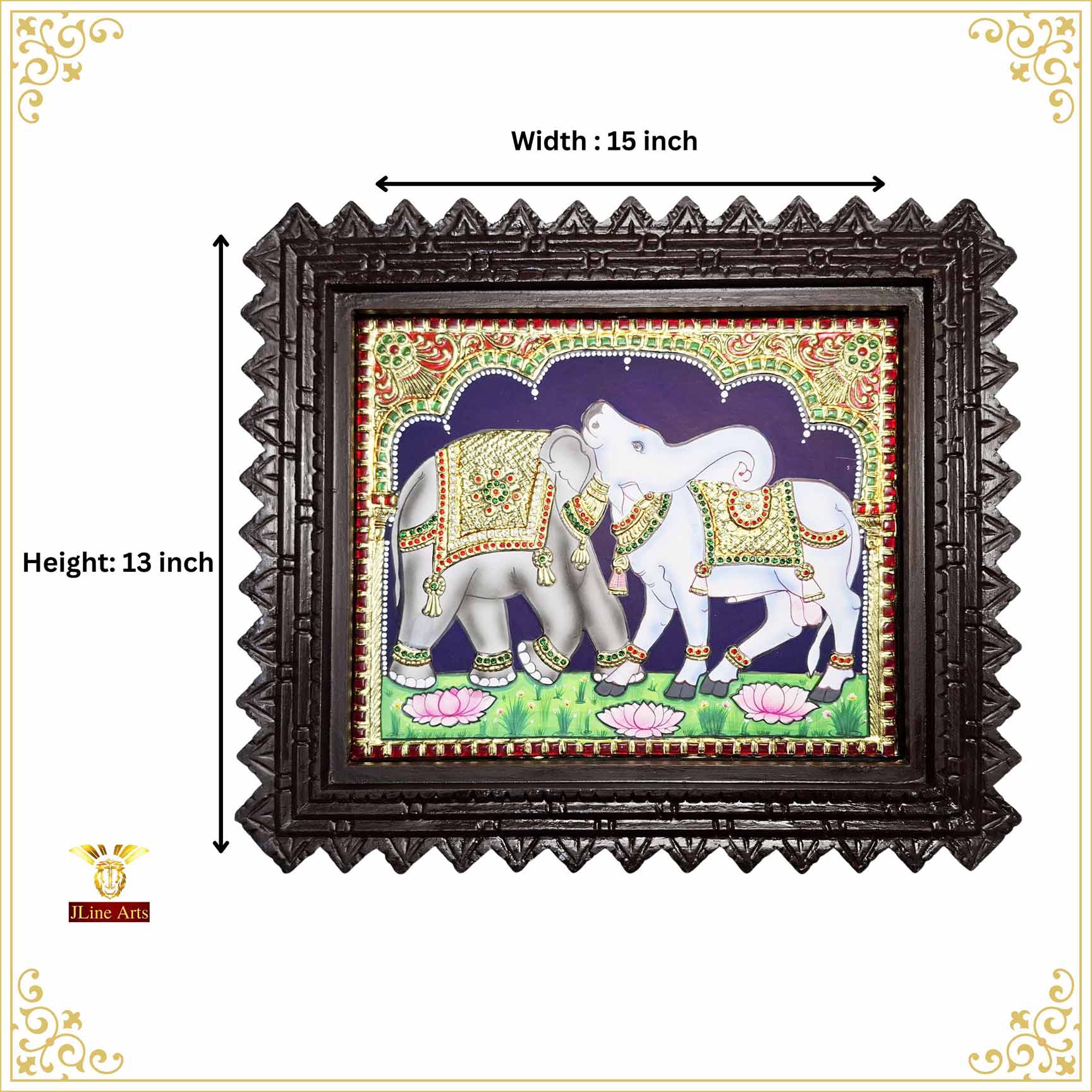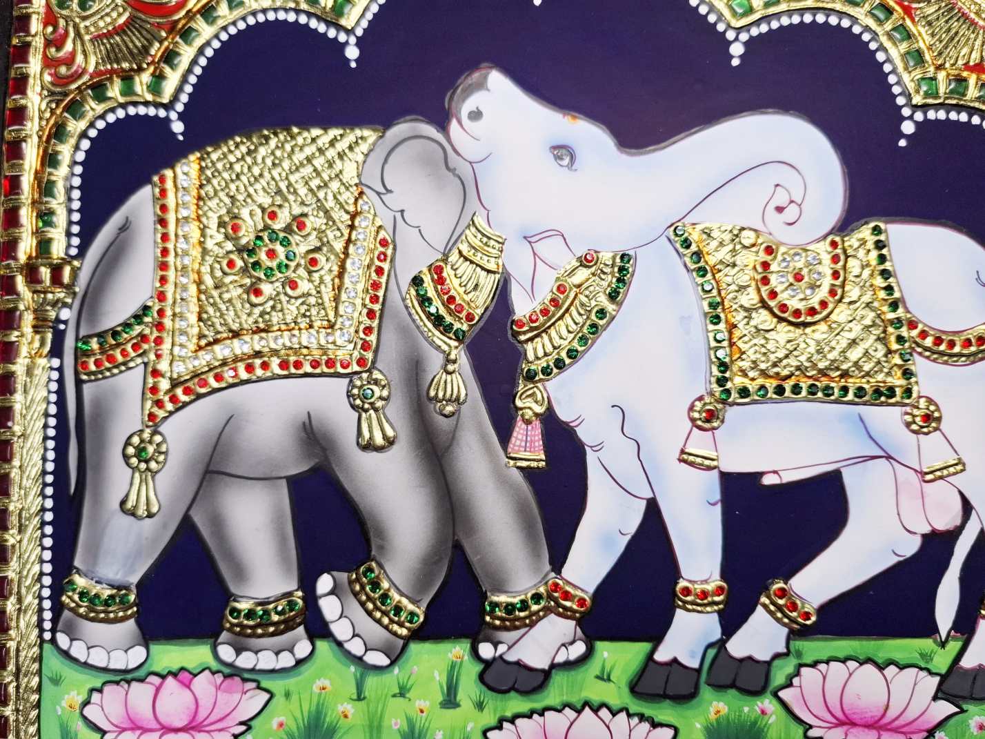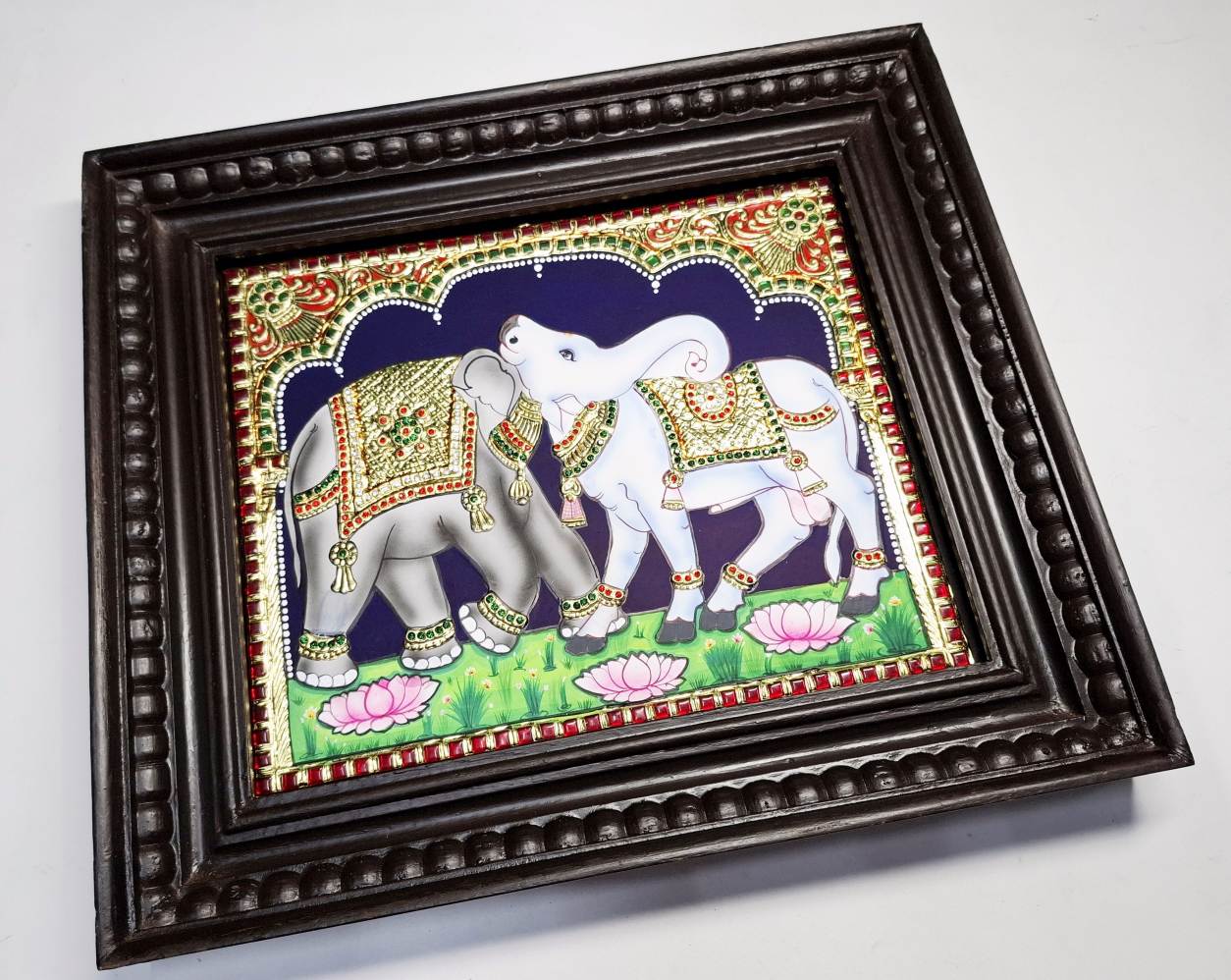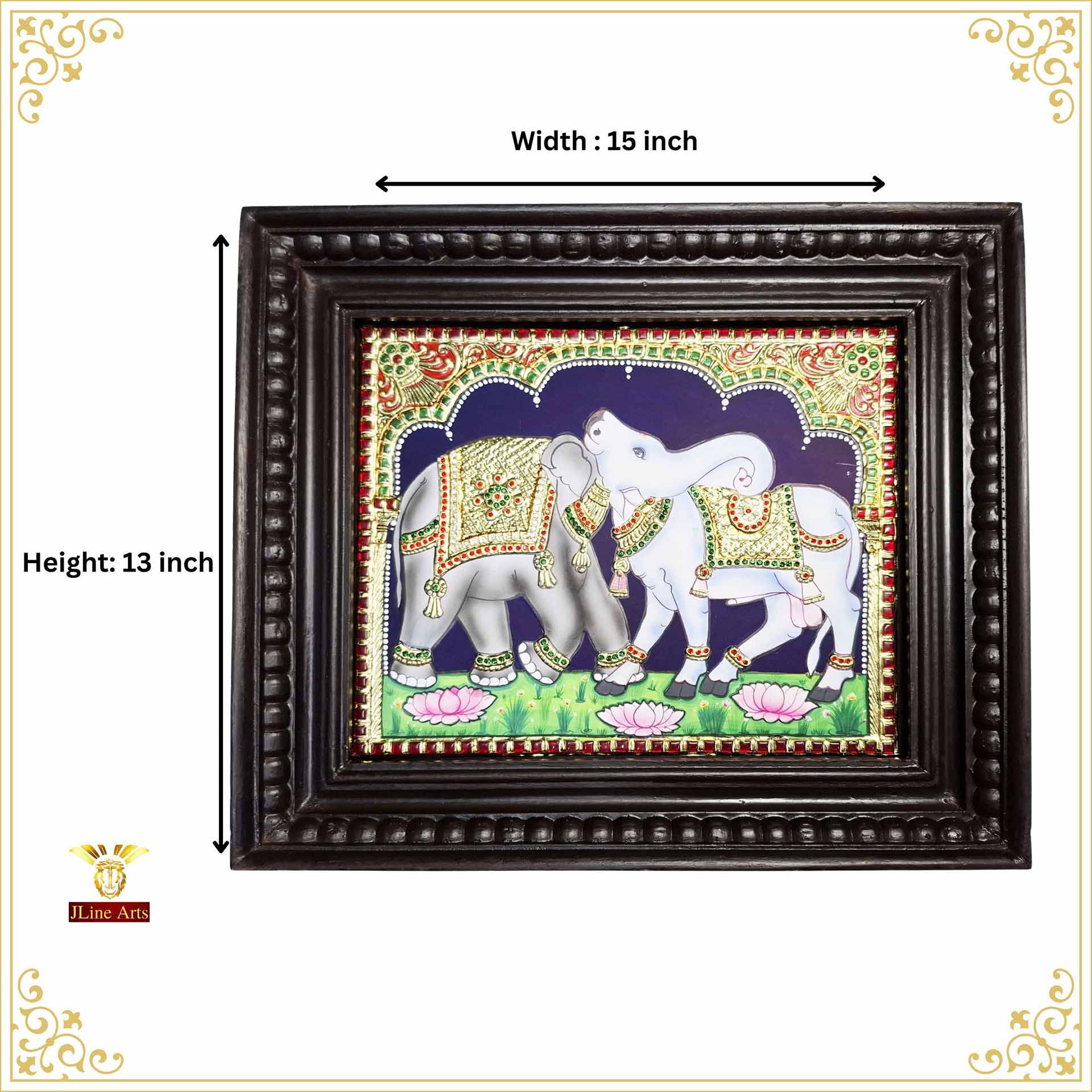 Bring home the elegance of handcrafted Indian art with this 15×13 inch Tanjore Painting featuring Elephant and Cow, framed in premium teakwood. Adorned with 22K gold foil detailing, this traditional masterpiece is perfect for pooja rooms, housewarming gifts, and spiritual décor. Ready to ship with global shipping—ideal for art lovers and collectors.