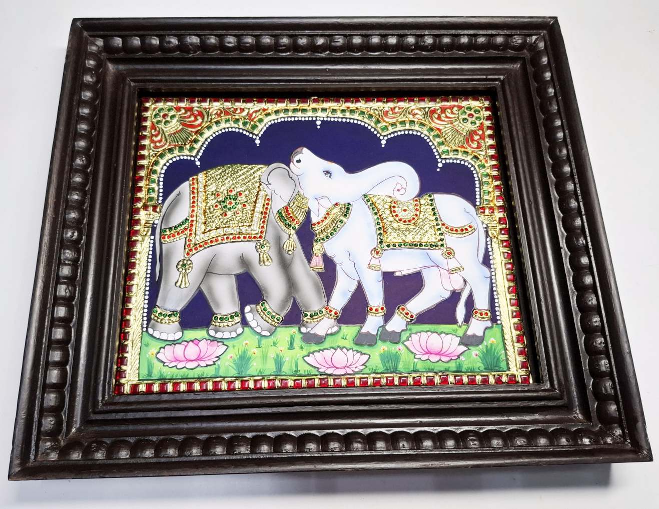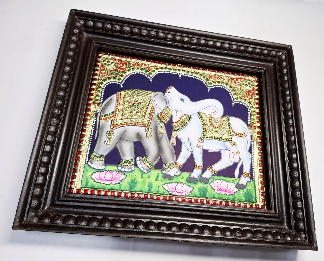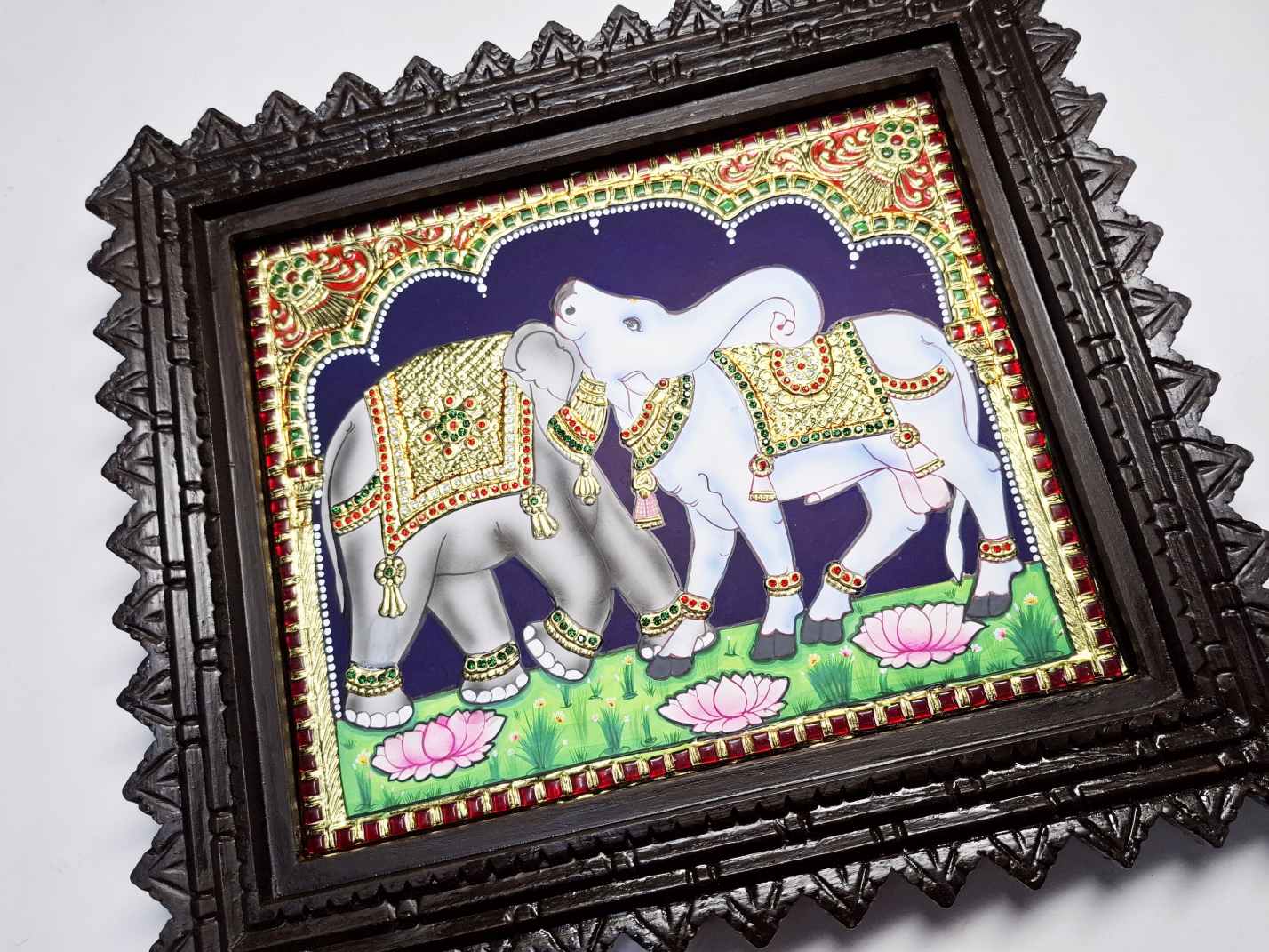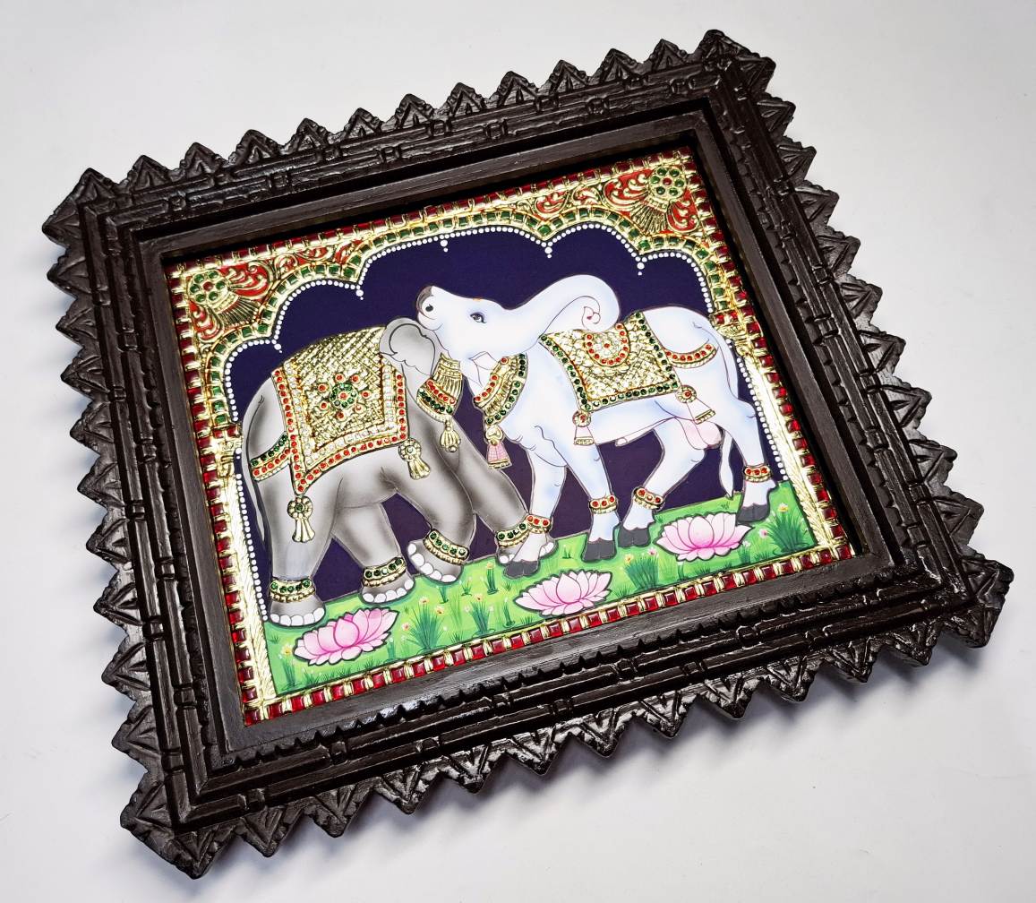 Bring home the elegance of handcrafted Indian art with this 15×13 inch Tanjore Painting featuring Elephant and Cow, framed in premium teakwood. Adorned with 22K gold foil detailing, this traditional masterpiece is perfect for pooja rooms, housewarming gifts, and spiritual décor. Ready to ship with global shipping—ideal for art lovers and collectors.