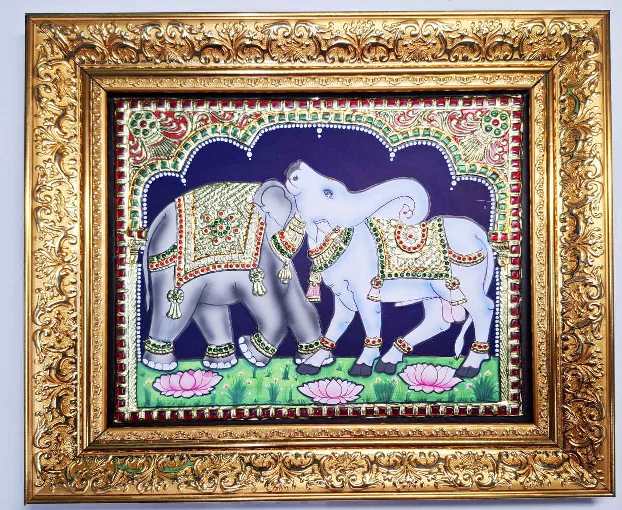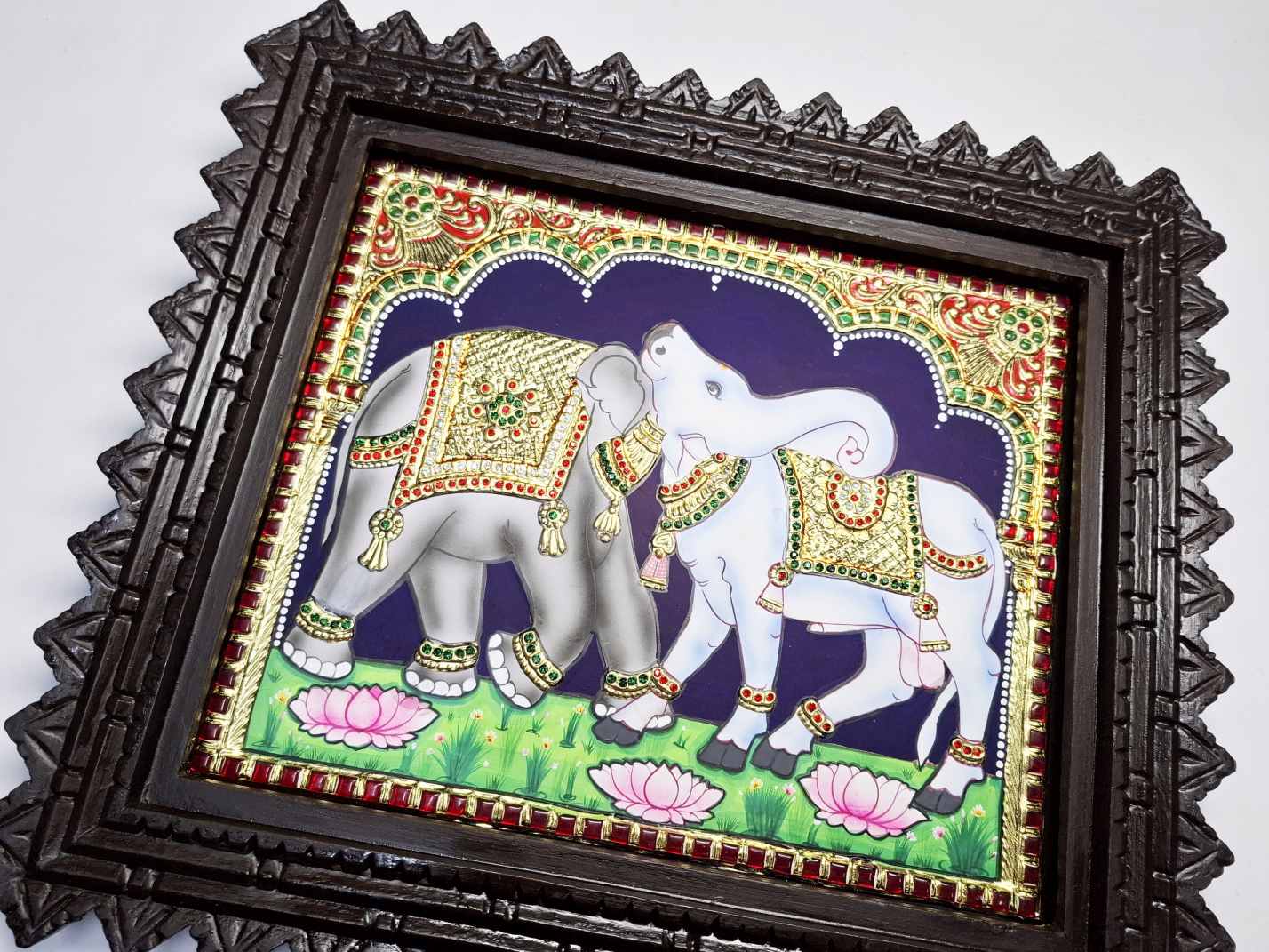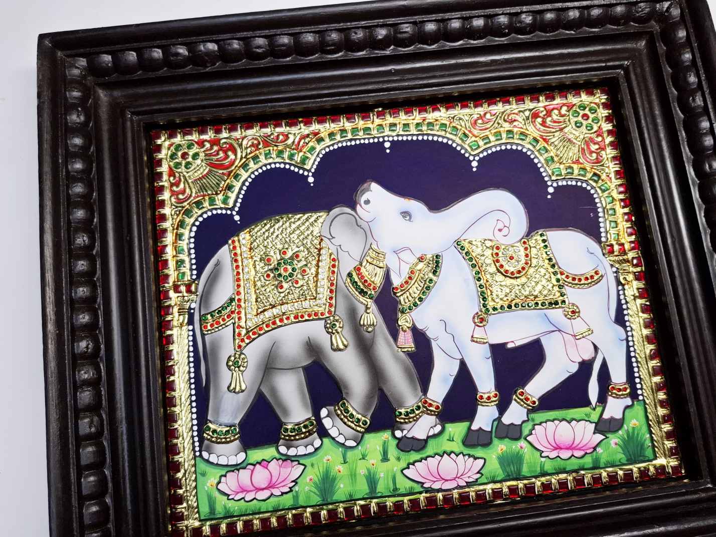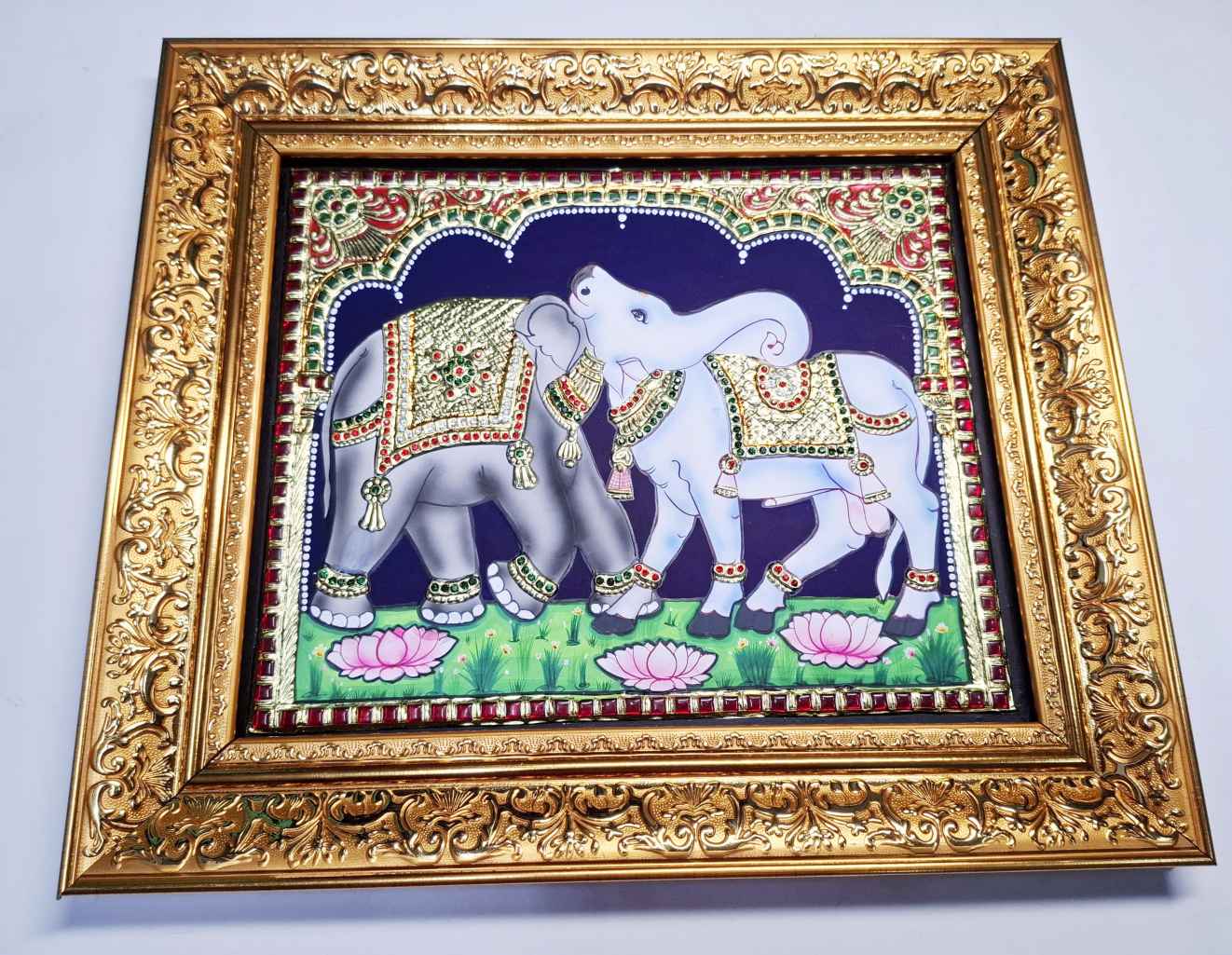 Bring home the elegance of handcrafted Indian art with this 15×13 inch Tanjore Painting featuring Elephant and Cow, framed in premium teakwood. Adorned with 22K gold foil detailing, this traditional masterpiece is perfect for pooja rooms, housewarming gifts, and spiritual décor. Ready to ship with global shipping—ideal for art lovers and collectors.