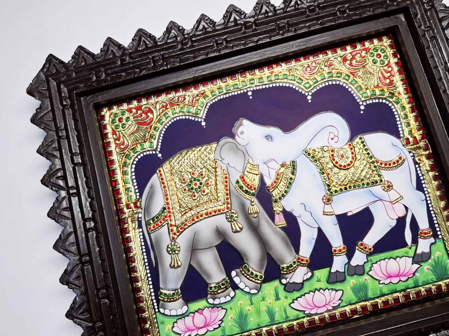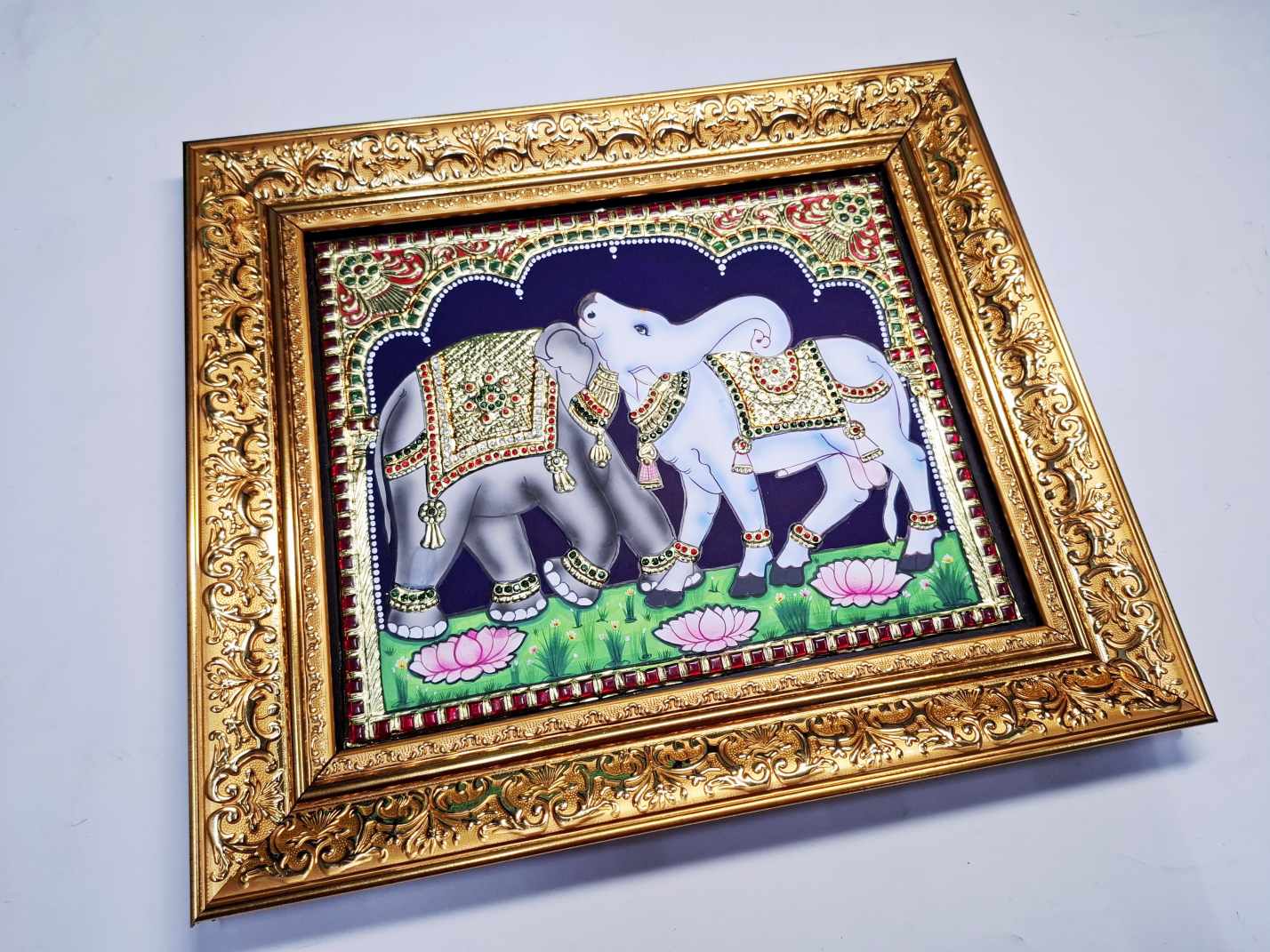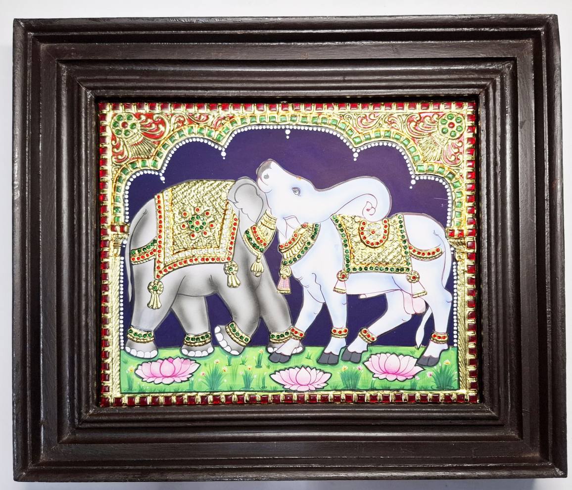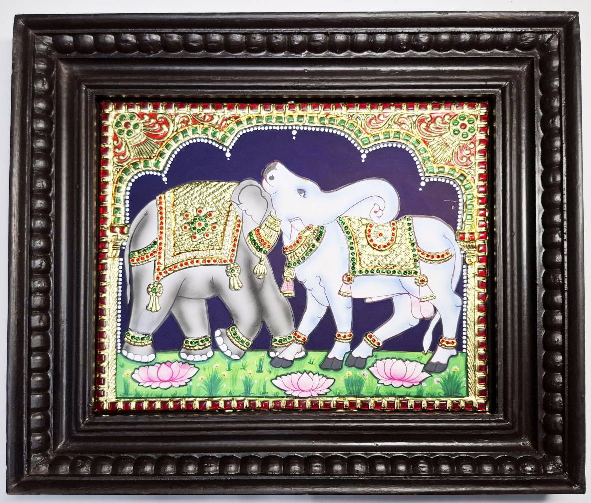 Bring home the elegance of handcrafted Indian art with this 15×13 inch Tanjore Painting featuring Elephant and Cow, framed in premium teakwood. Adorned with 22K gold foil detailing, this traditional masterpiece is perfect for pooja rooms, housewarming gifts, and spiritual décor. Ready to ship with global shipping—ideal for art lovers and collectors.