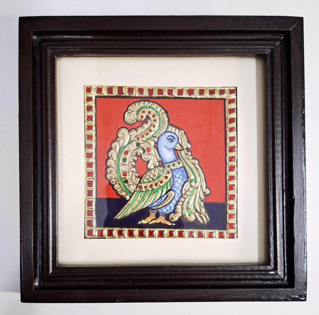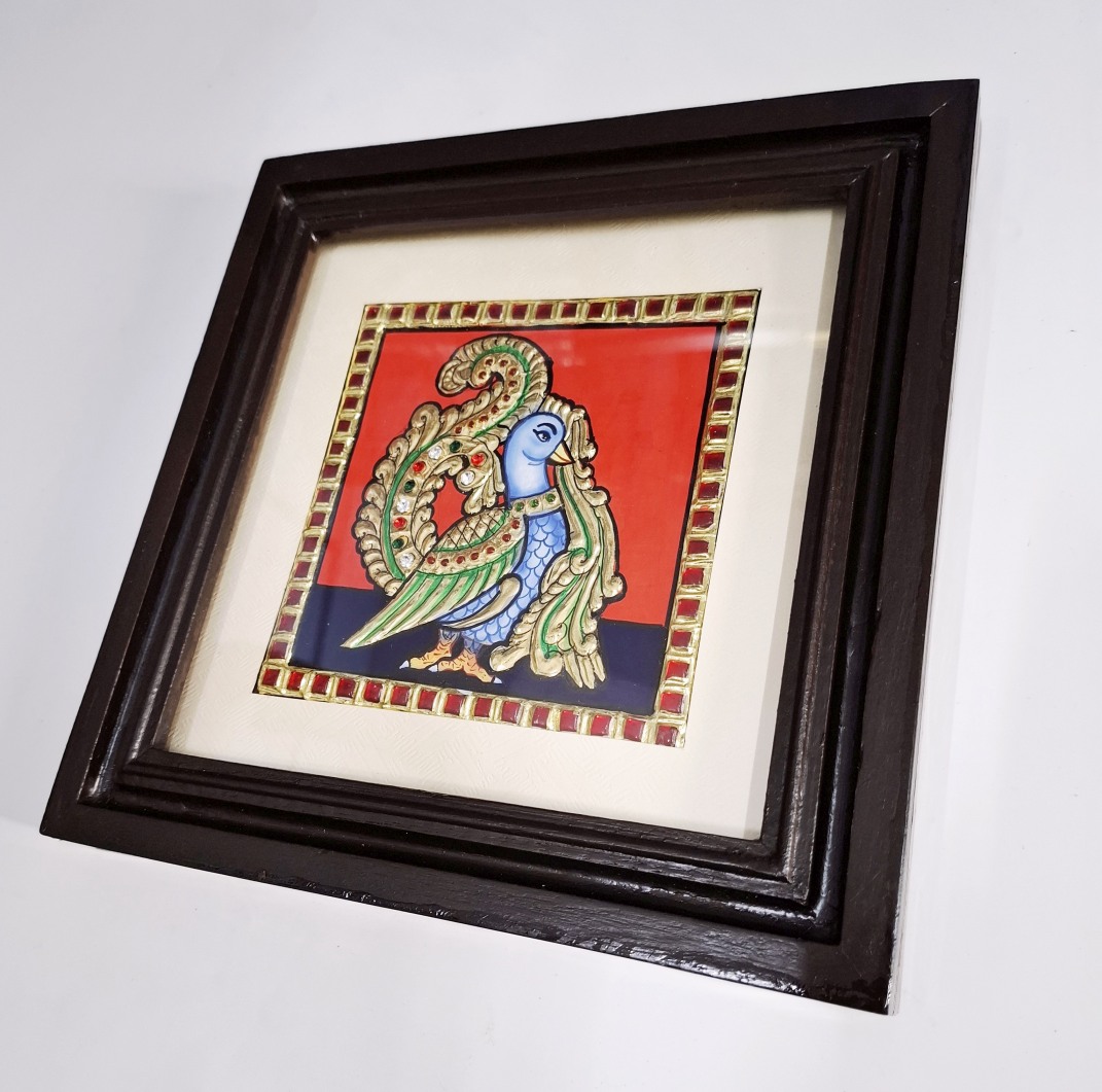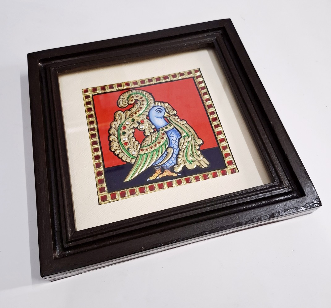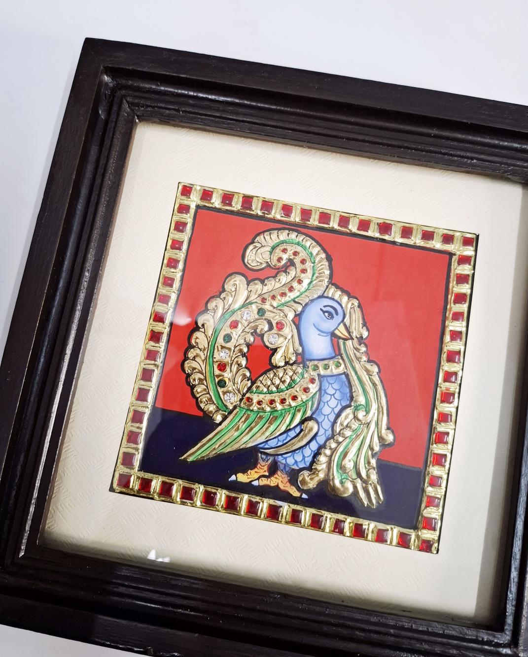 Artwork: Peacock Tanjore painting with 22K gold foil and teakwood frame 9.5x9.5 inches
