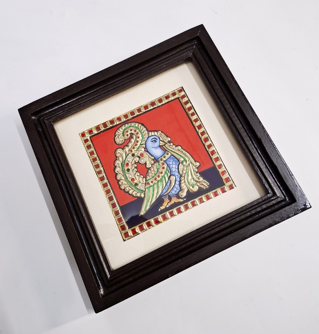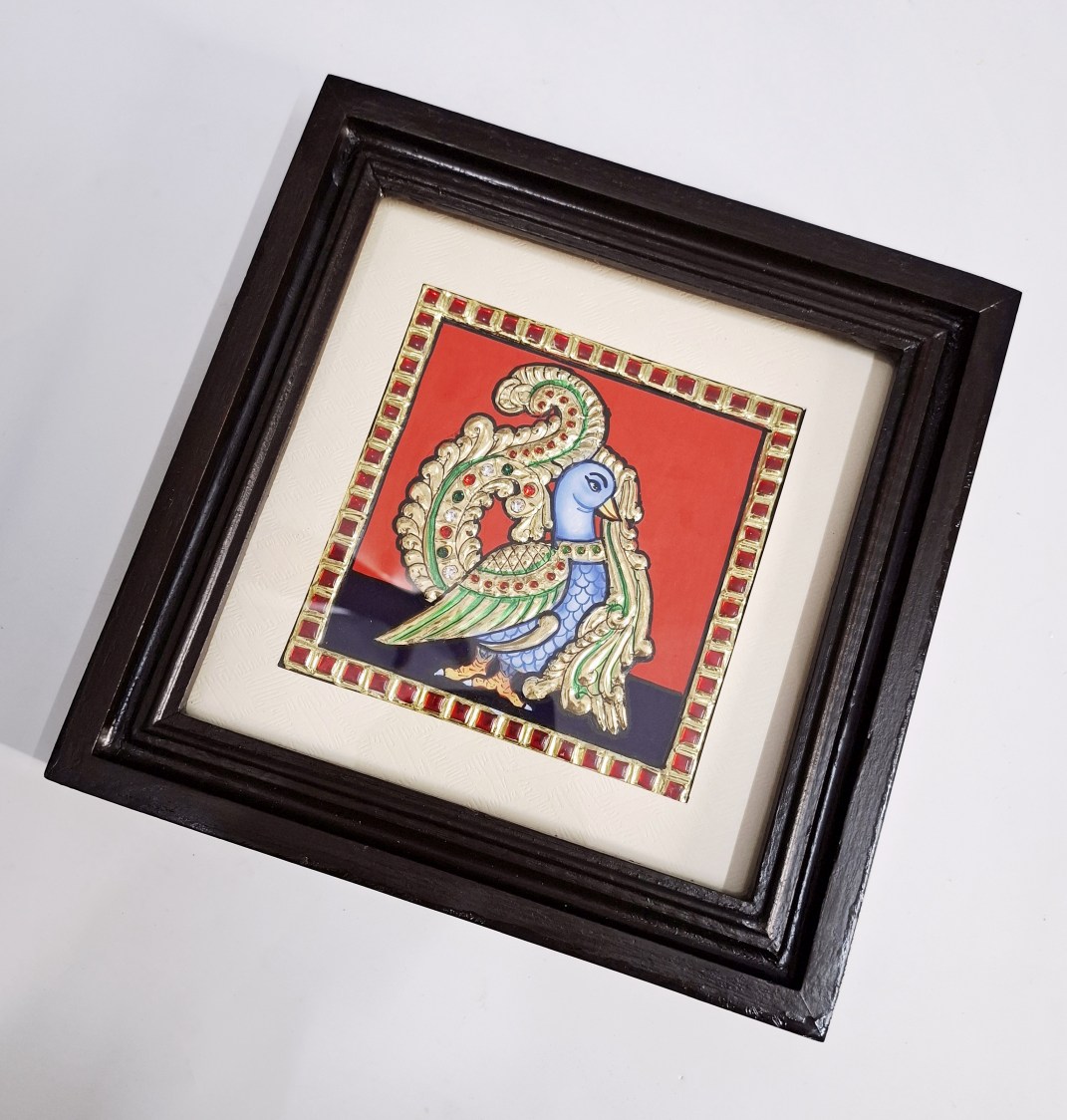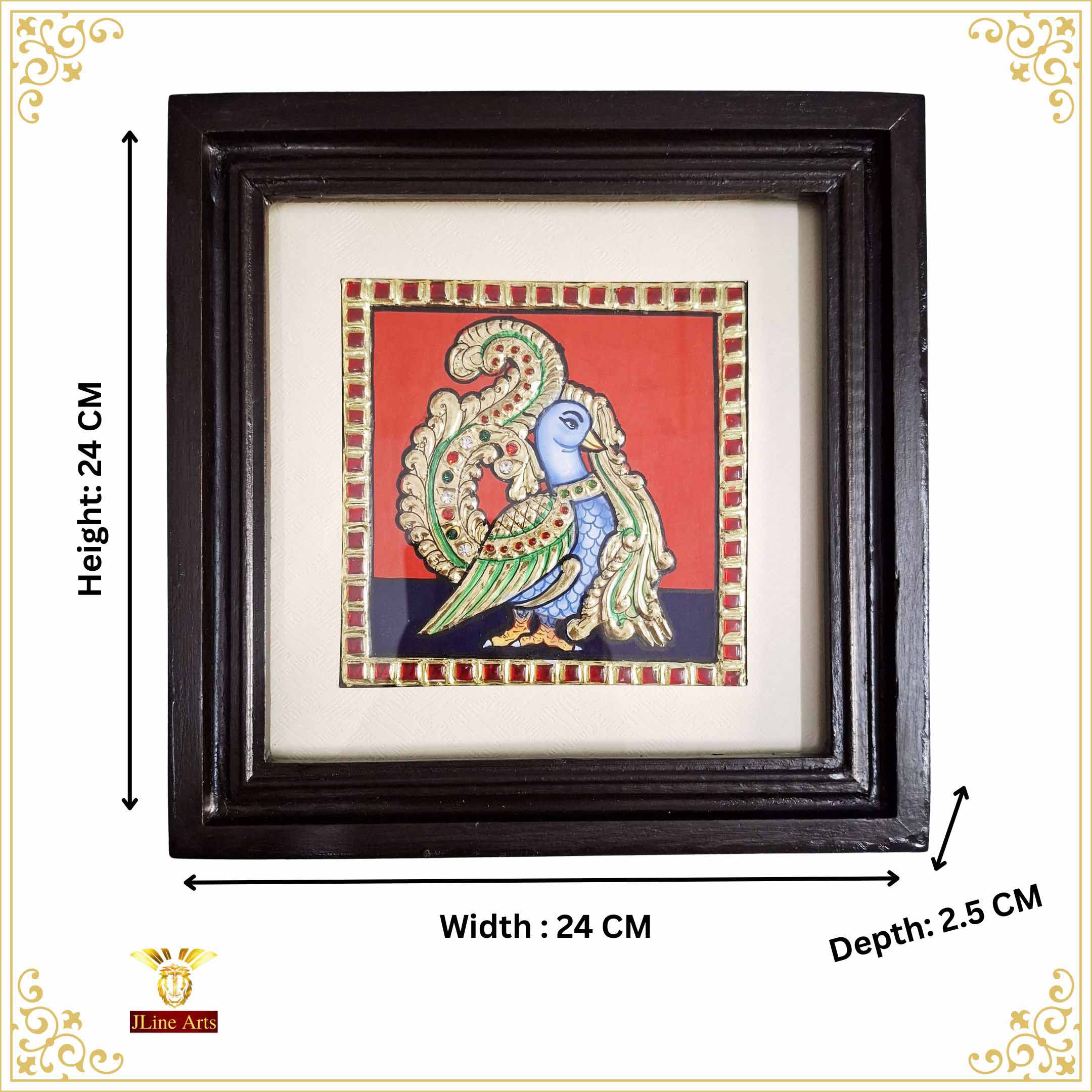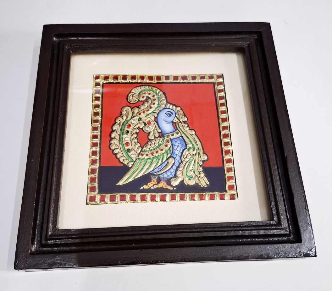Artwork: Peacock Tanjore painting with 22K gold foil and teakwood frame 9.5x9.5 inches