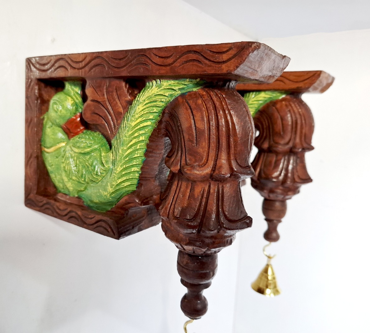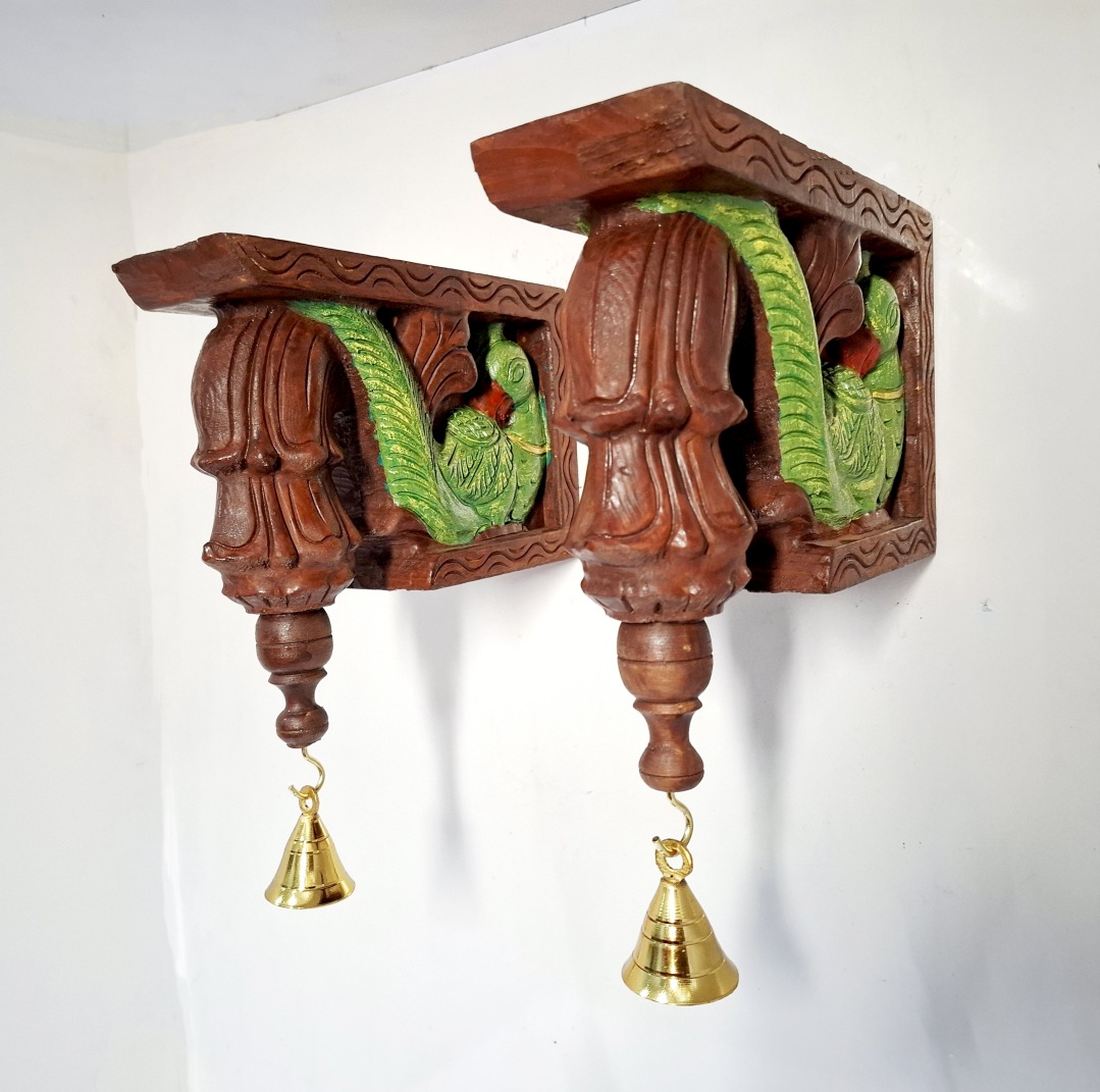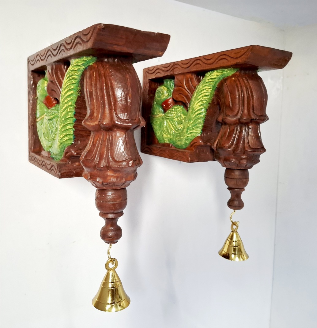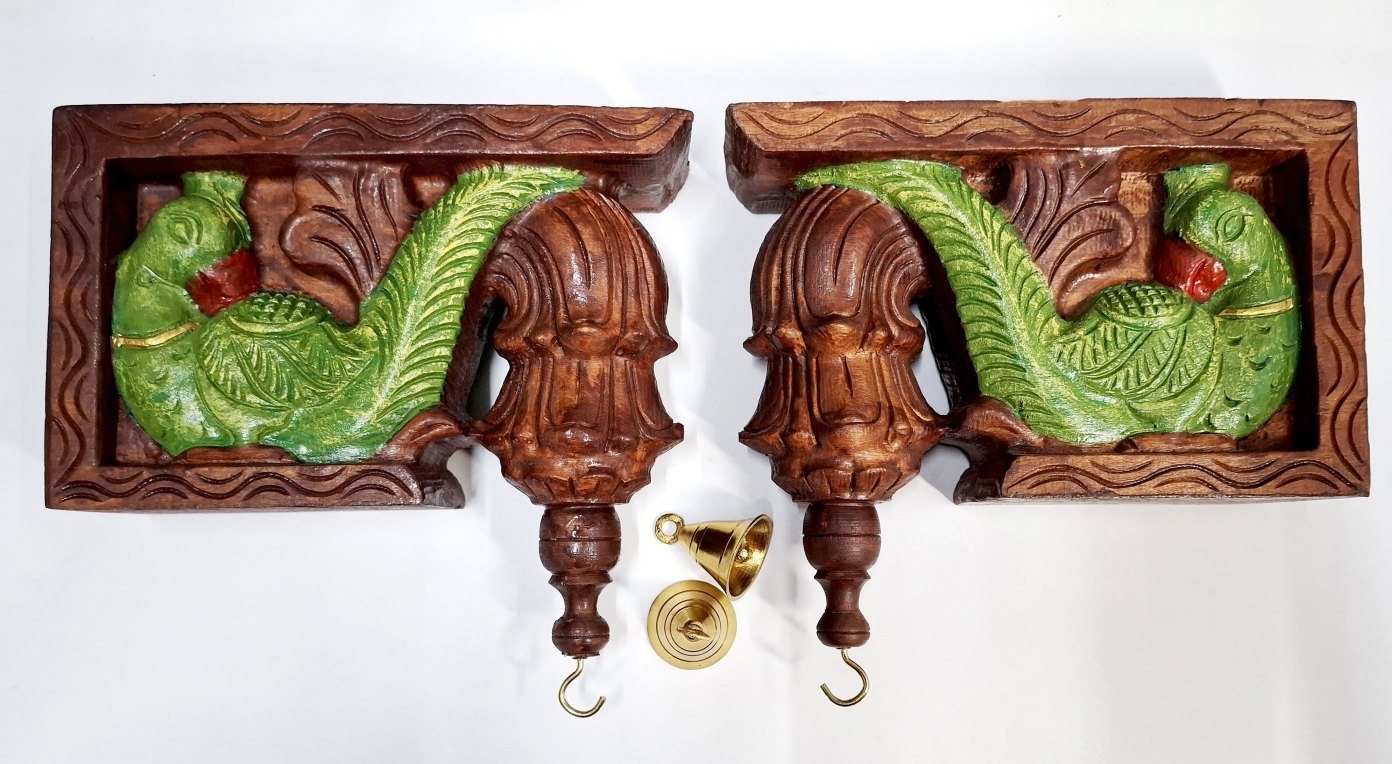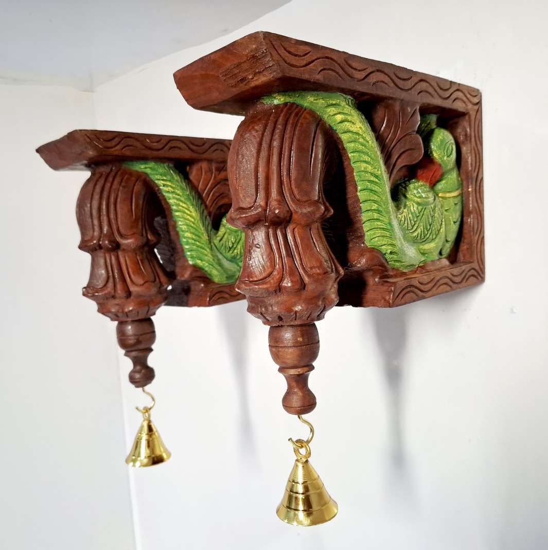 Wooden Bodhil Wall Bracket Pair 9 Inch with Peacock Statue | Hand-Carved Solid Wood & Brass Bells