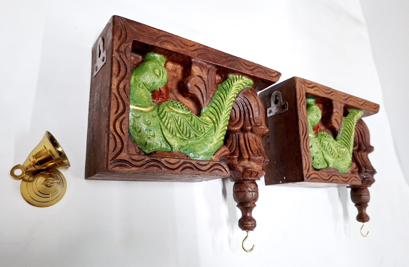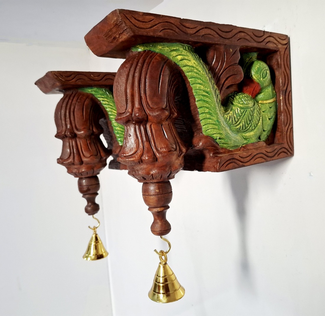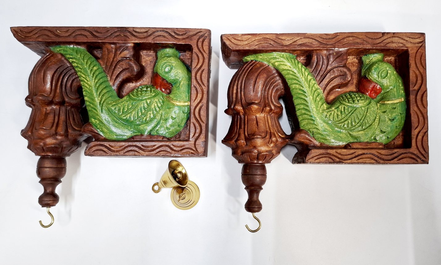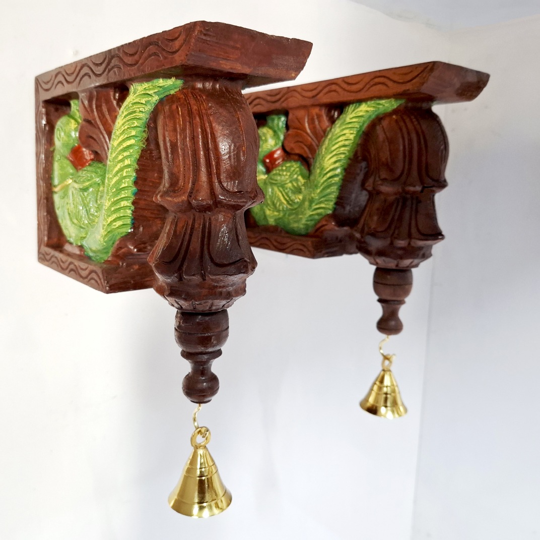 Wooden Bodhil Wall Bracket Pair 9 Inch with Peacock Statue | Hand-Carved Solid Wood & Brass Bells
