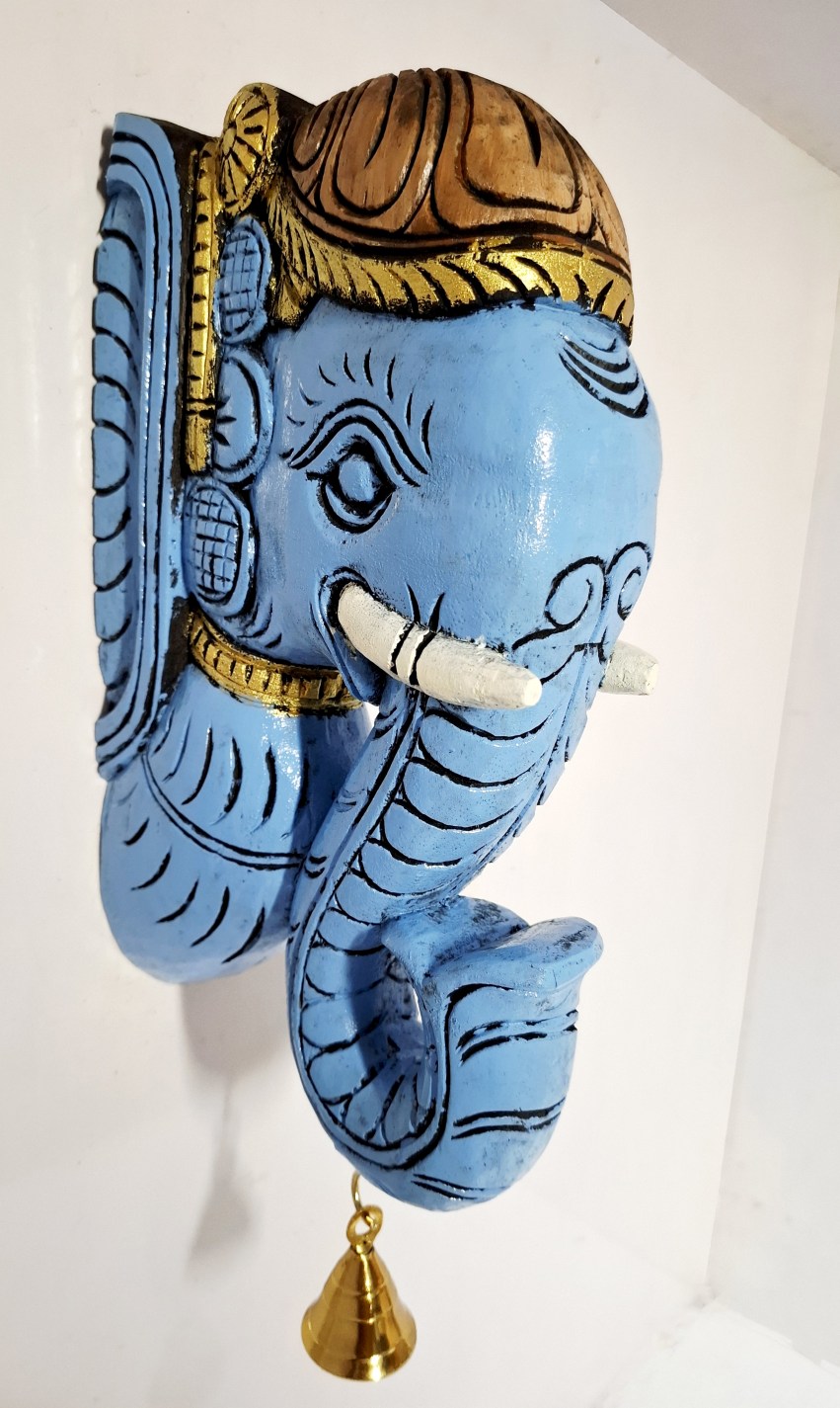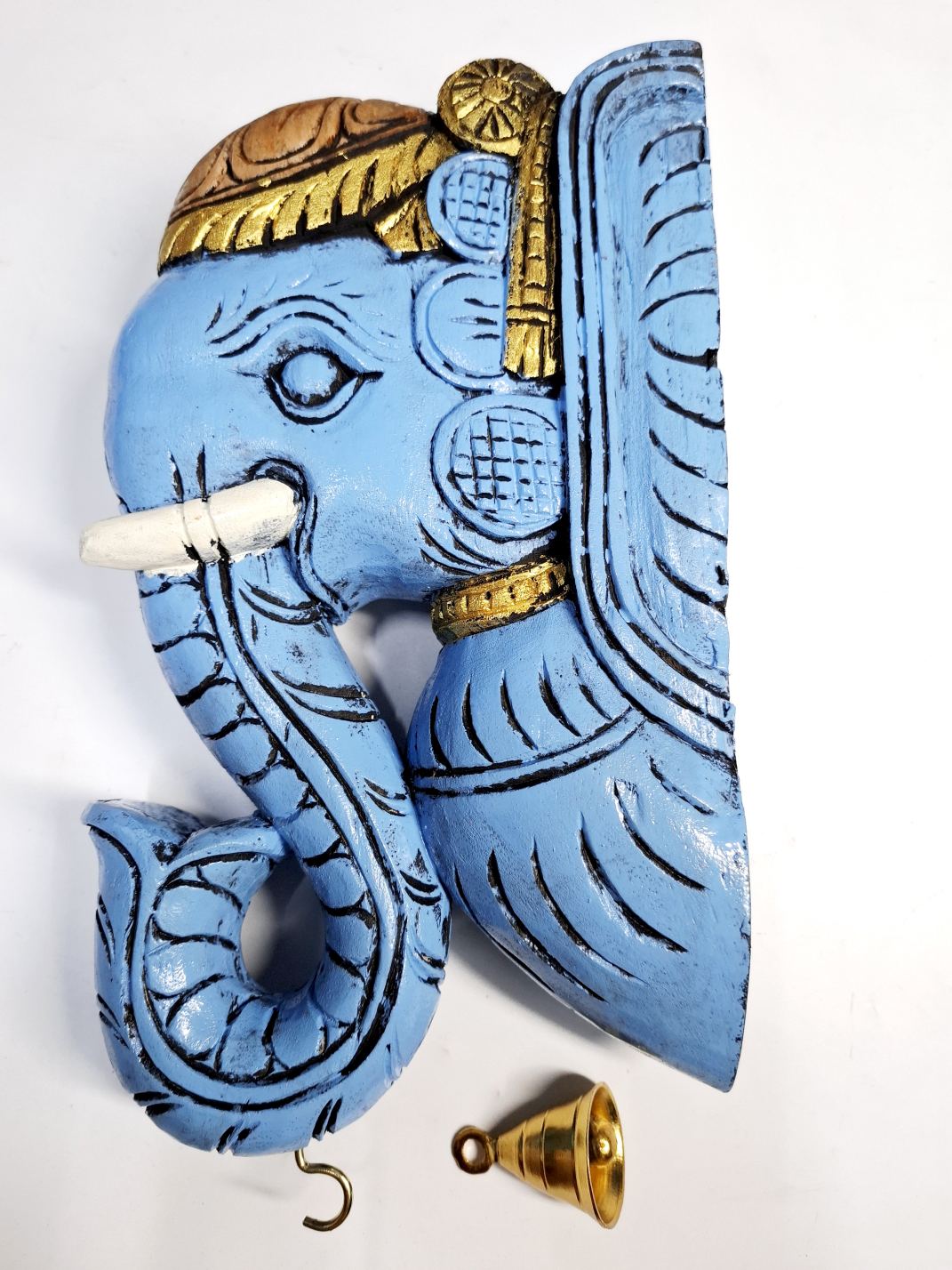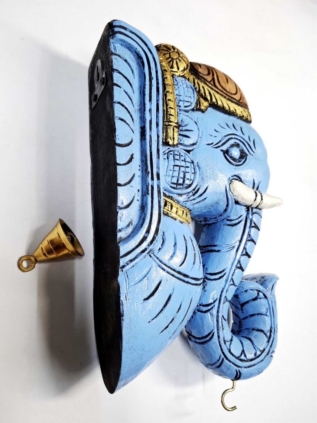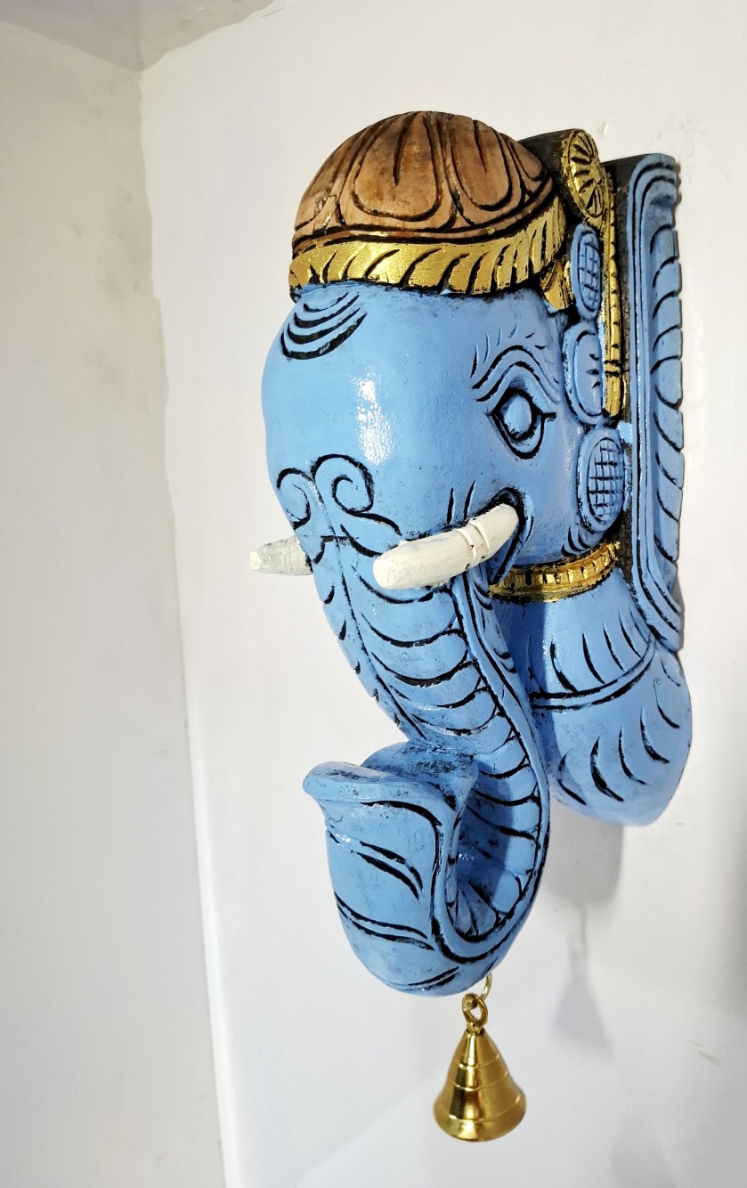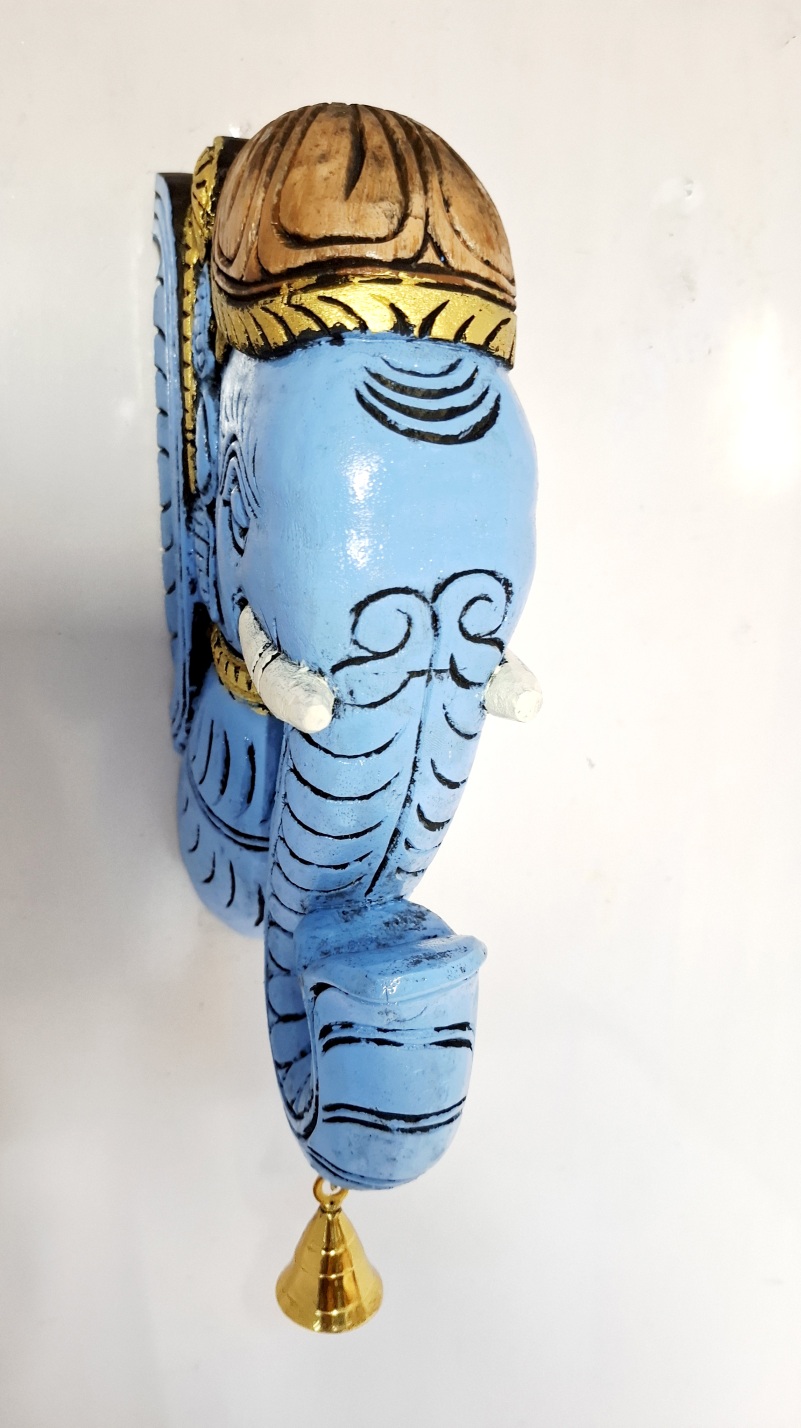 Artwork: Hand-carved wooden elephant head wall bracket with brass bell, brown finish pooja room and home wall decor.