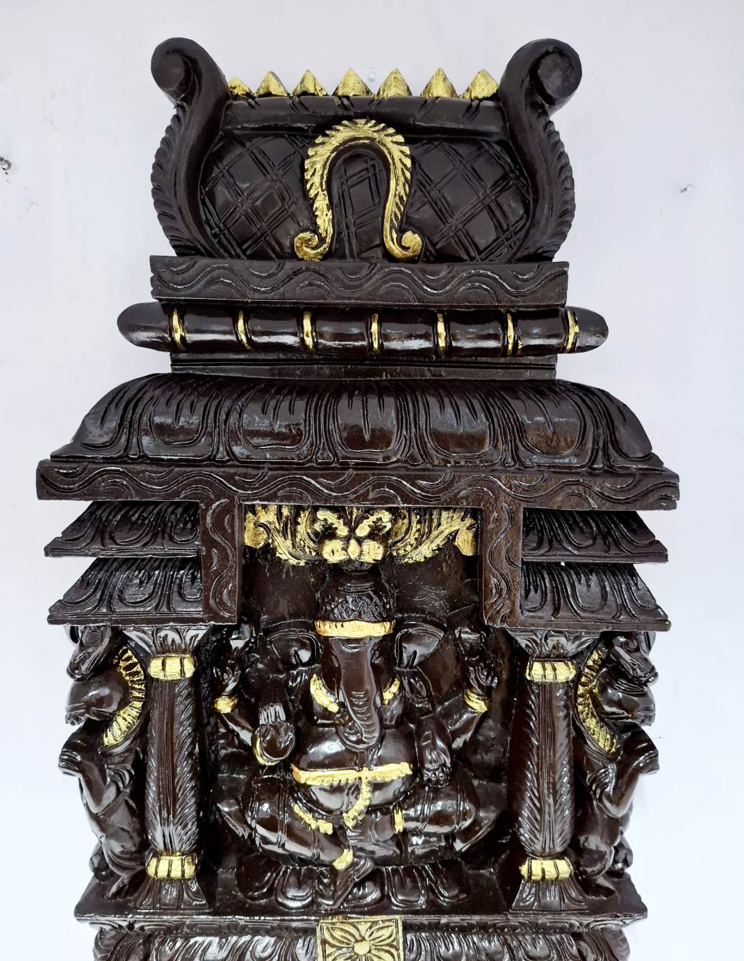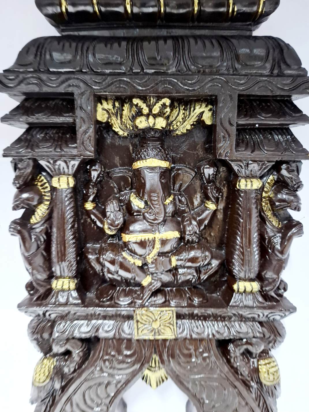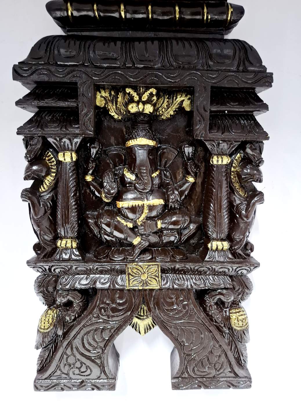 Exquisitely hand-carved Wooden Ganesha Kavadi Wall Panel (24 Inch) in solid wood with golden detailing.Traditional South Indian temple-style art, showcasing Lord Ganesha in divine elegance.Perfect for home walls, pooja rooms, entrances, temples, and spiritual gifting.
