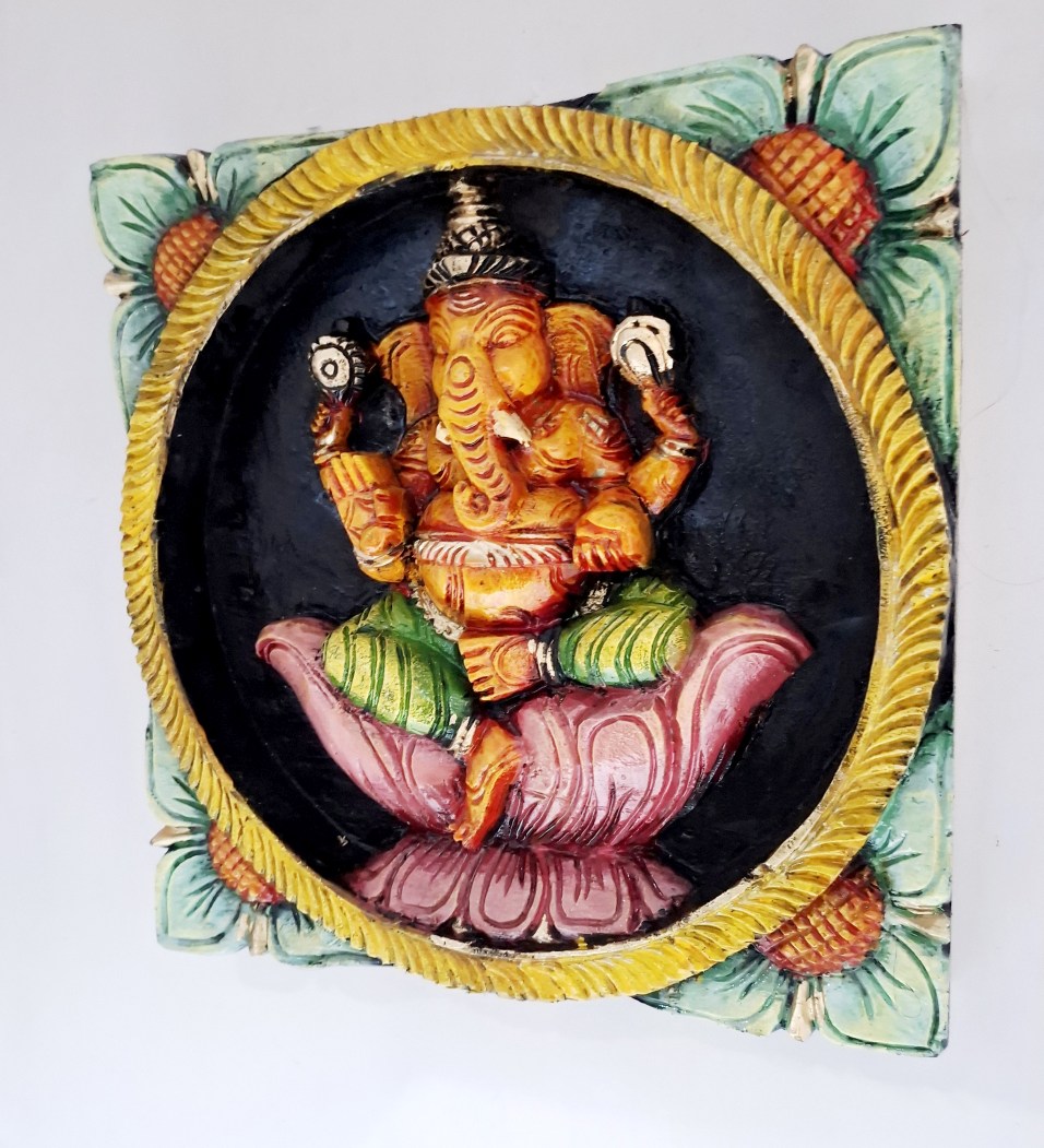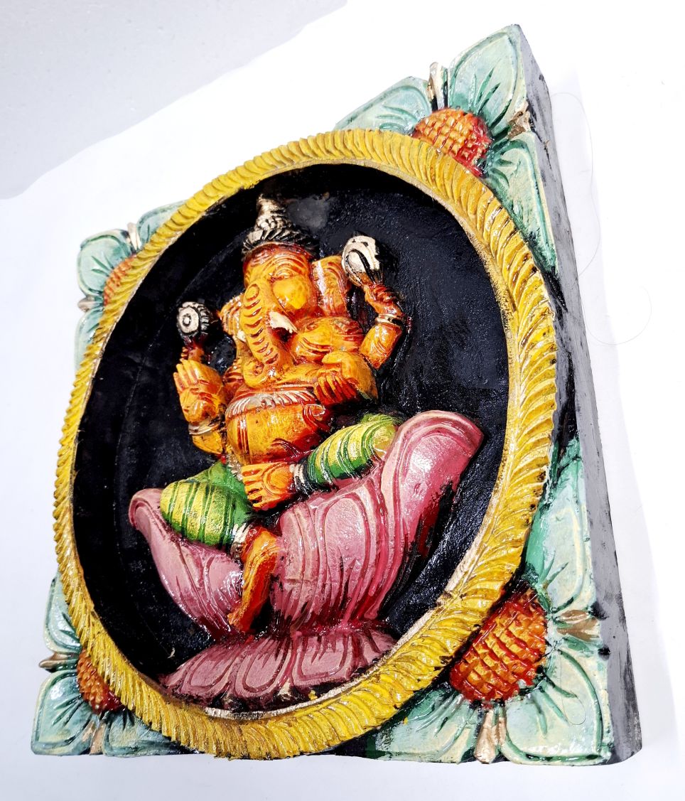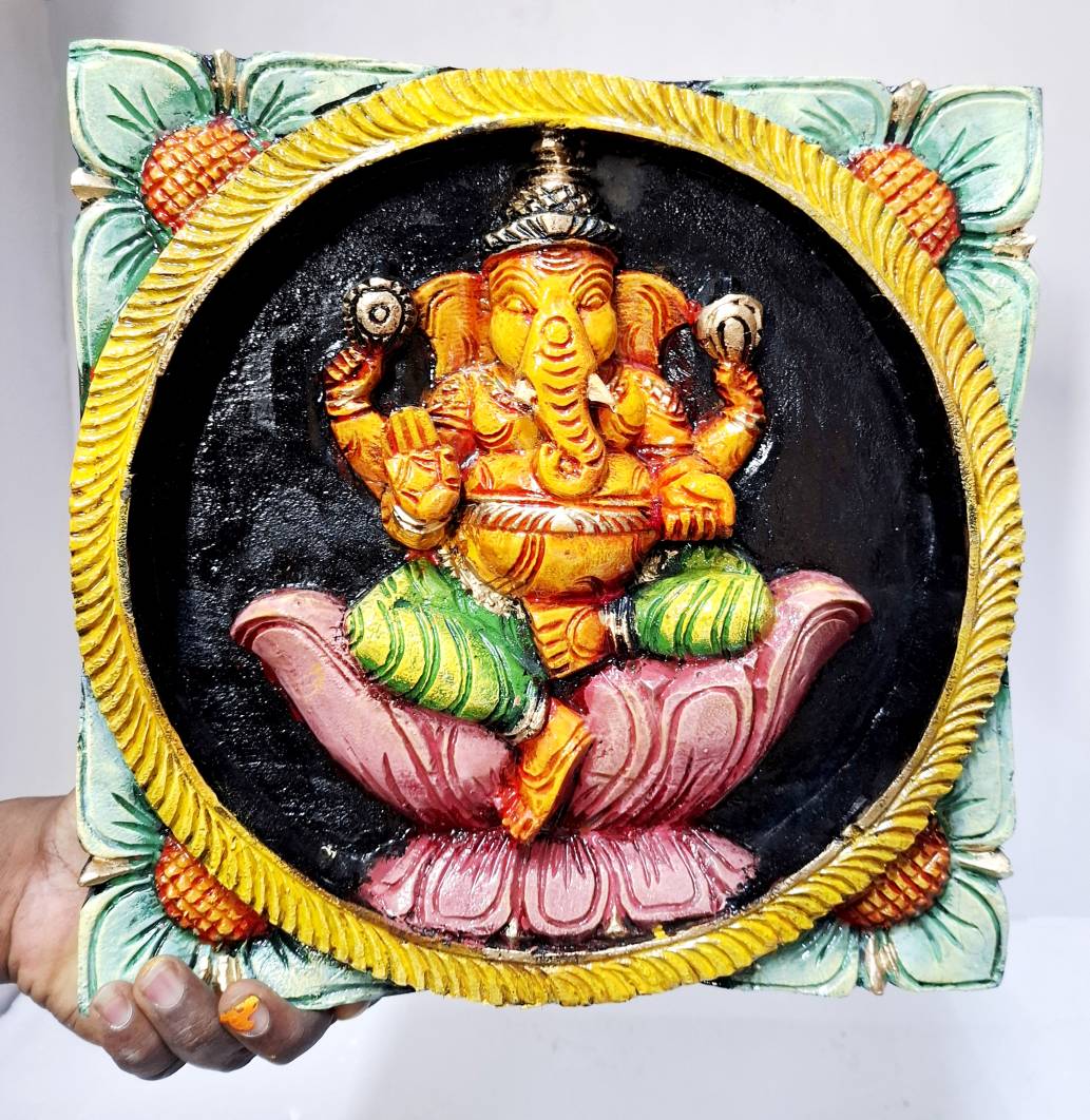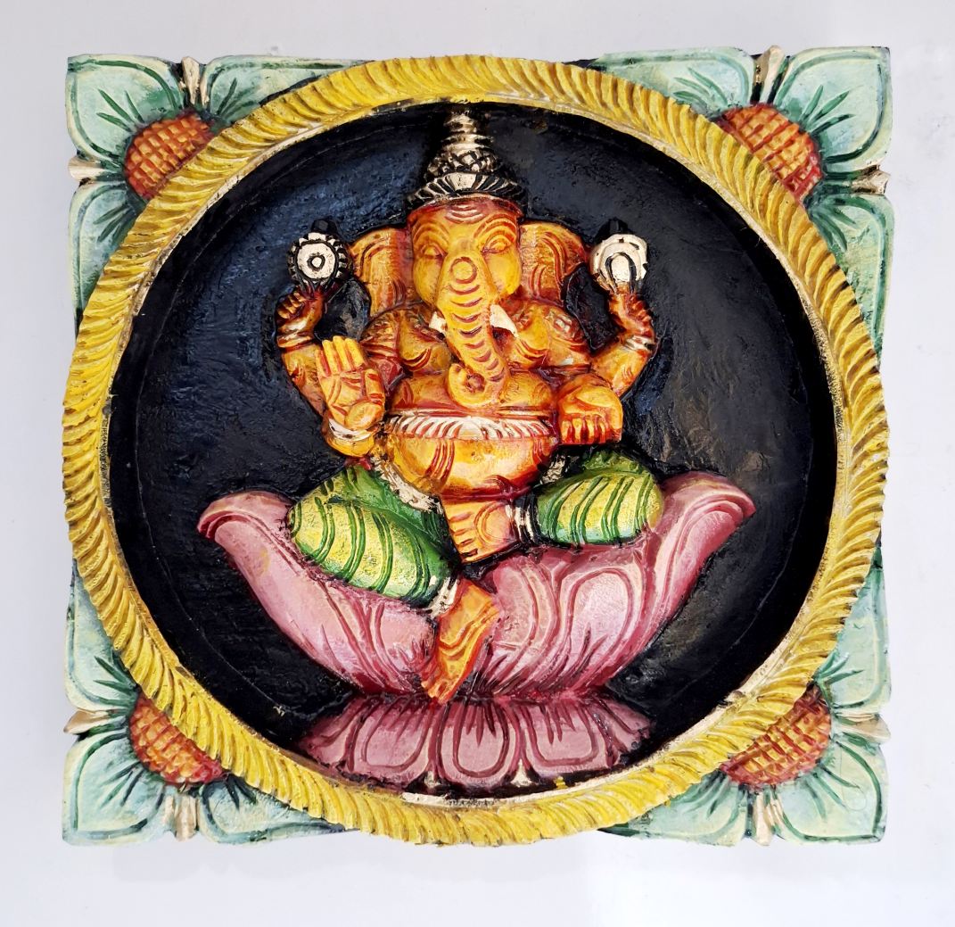 Artwork: Hand-carved wooden Ganesha wall panel in multicolor finish, Lord Ganesh seated on lotus for pooja room decor.