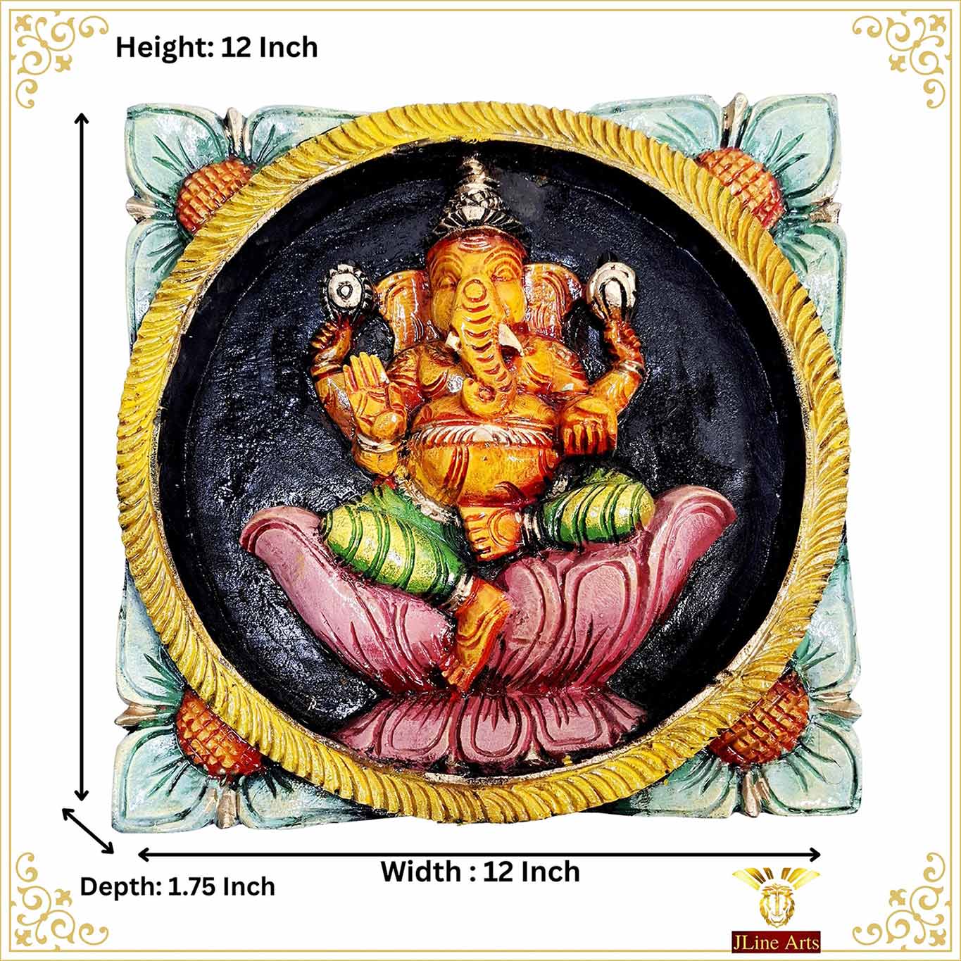 Wooden Ganesha Wall Panel 12 Inch Hand Carved Multicolor Pooja Decor