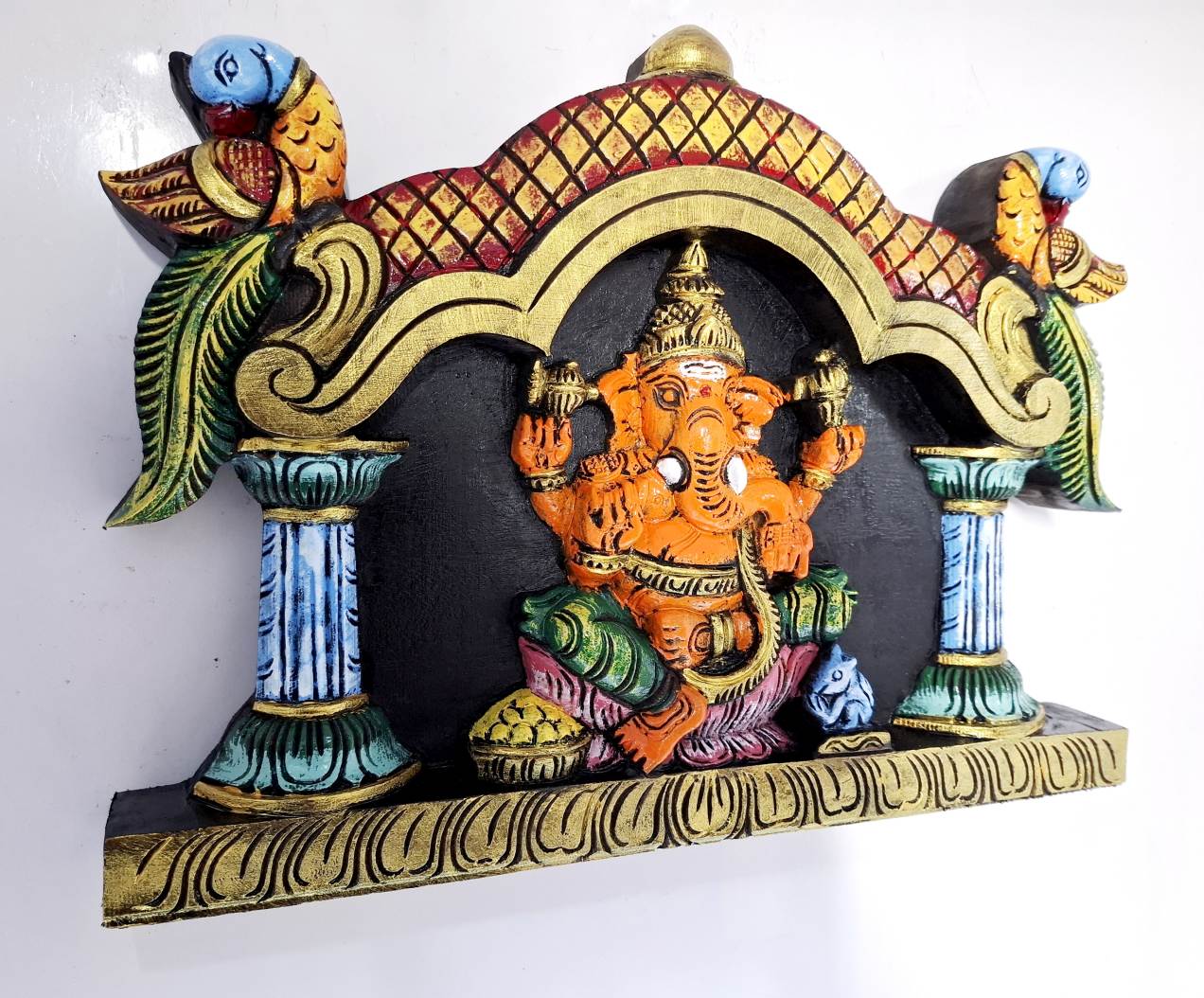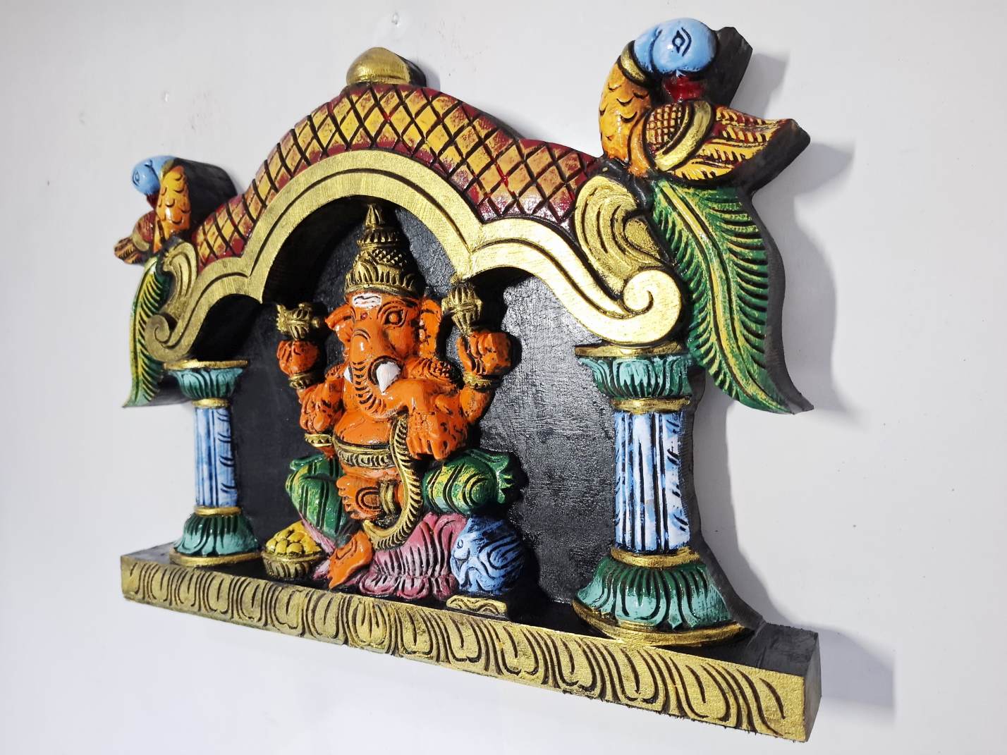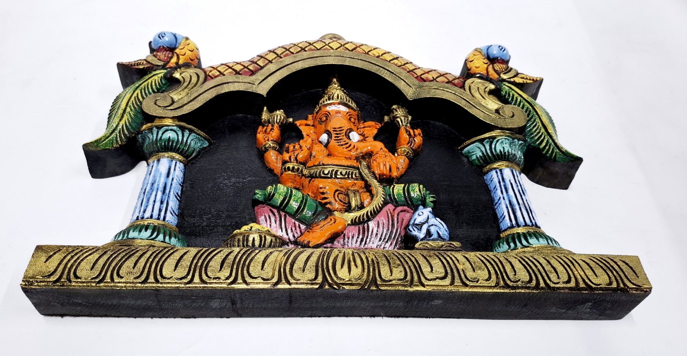 Artwork: Hand-carved wooden Ganesha wall panel in multicolor finish, South Indian wood carving decor for pooja room and home.
