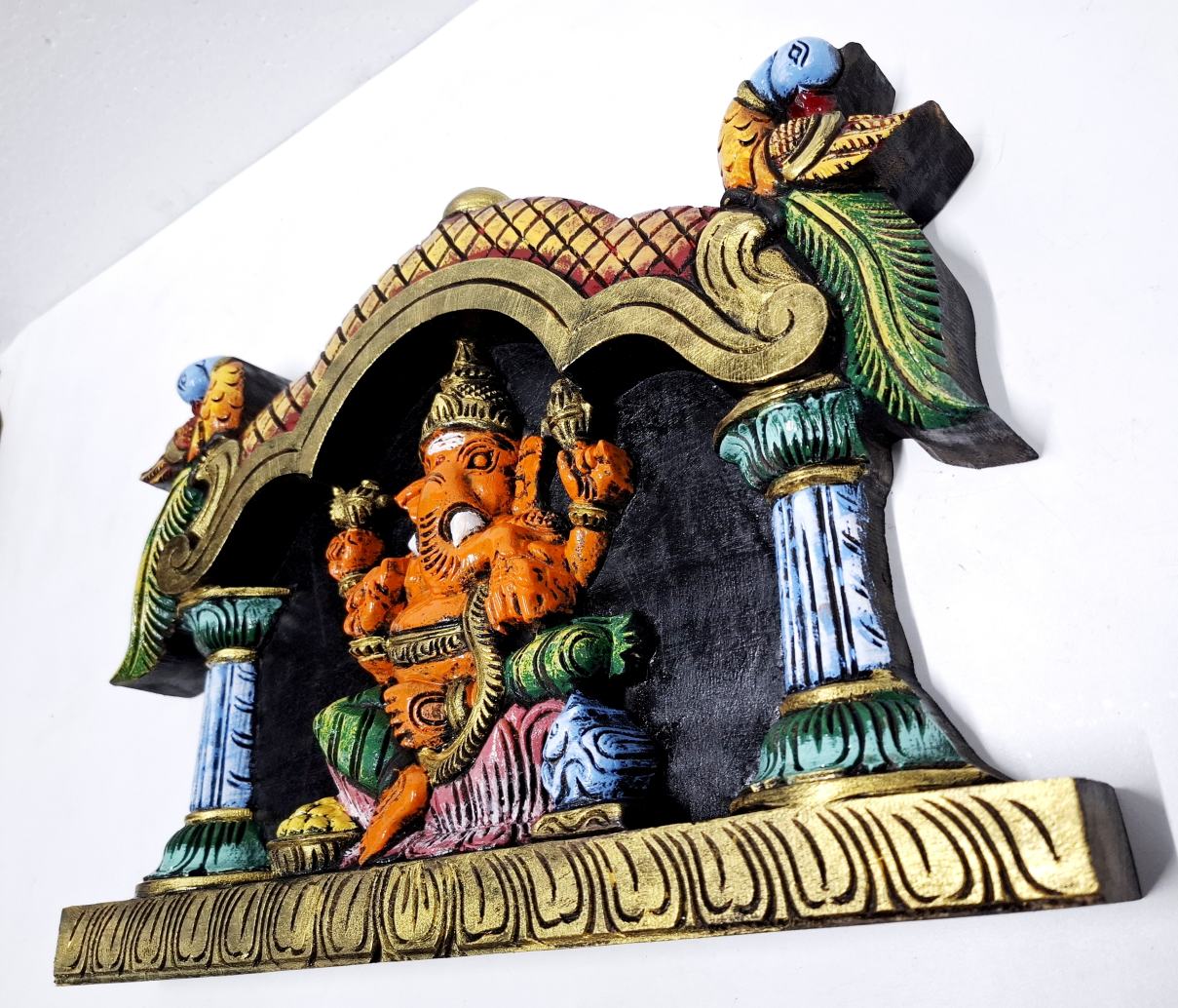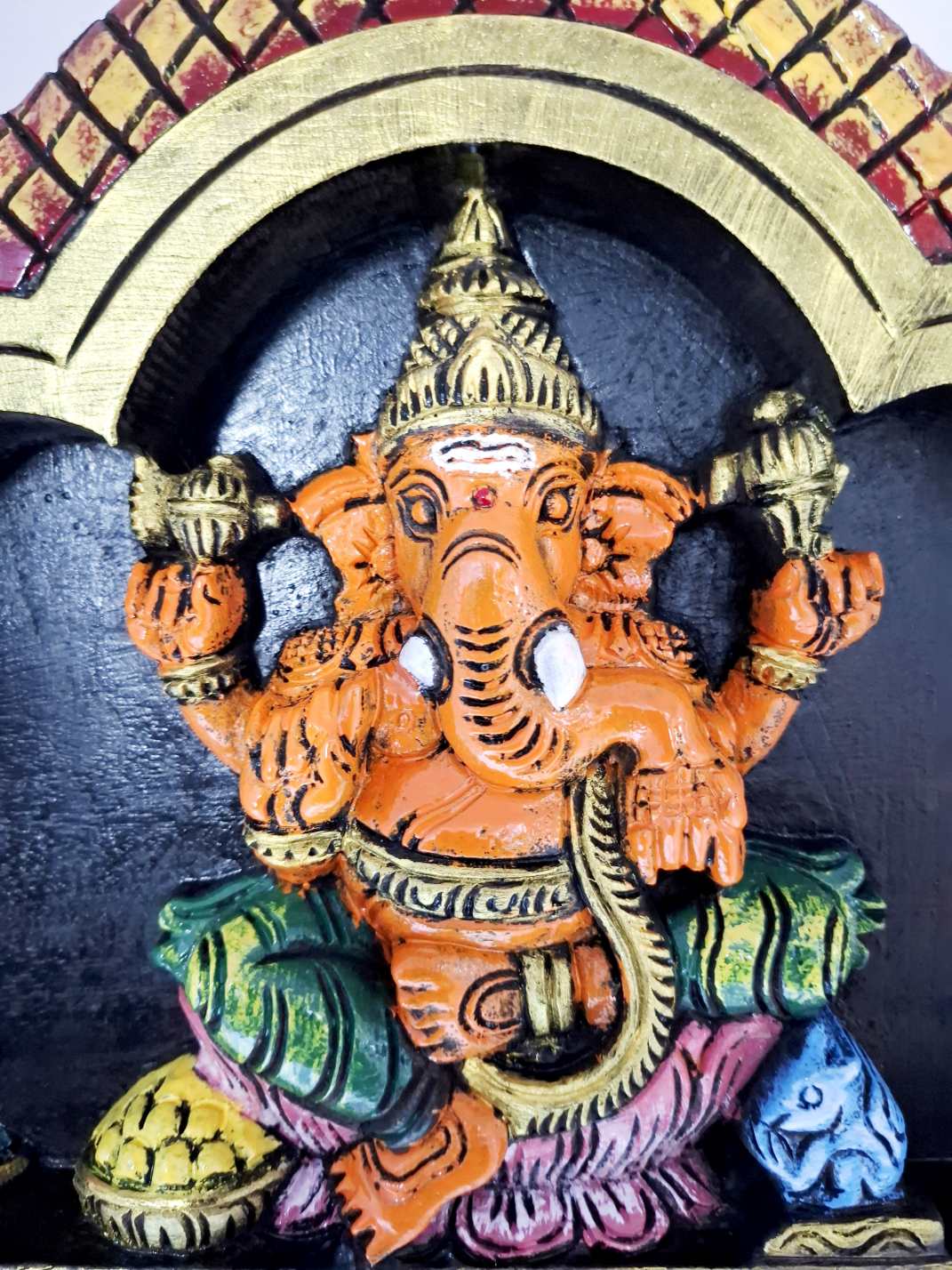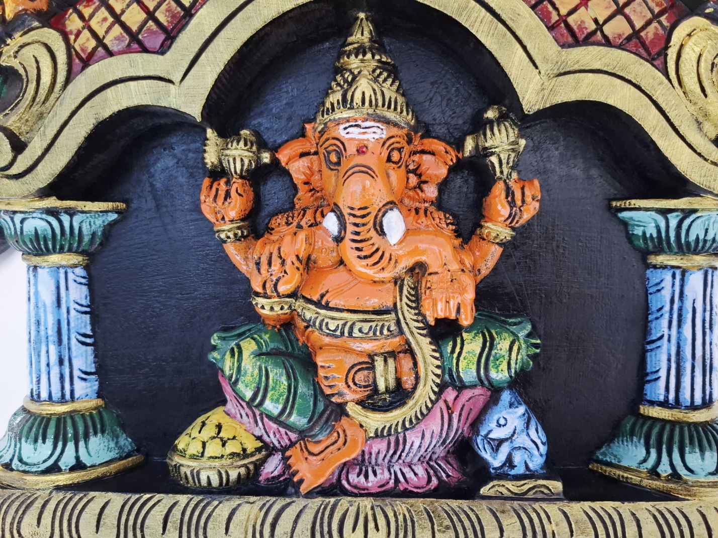 Artwork: Hand-carved wooden Ganesha wall panel in multicolor finish, South Indian wood carving decor for pooja room and home.