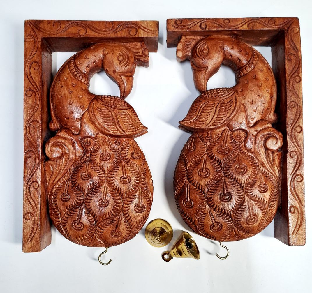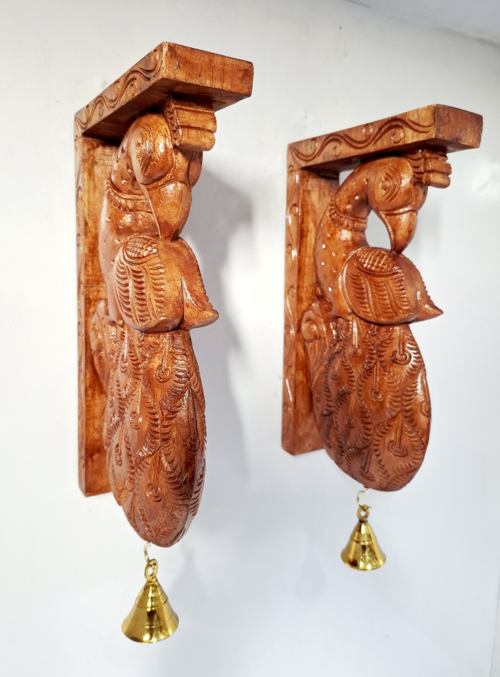 Artwork: Handcrafted Wooden Peacock Wall Bracket Pair | 12 Inch Brown Finish Solid Wood with Brass Bells | Traditional Indian Wall Hanging for Pooja Room & Living Room