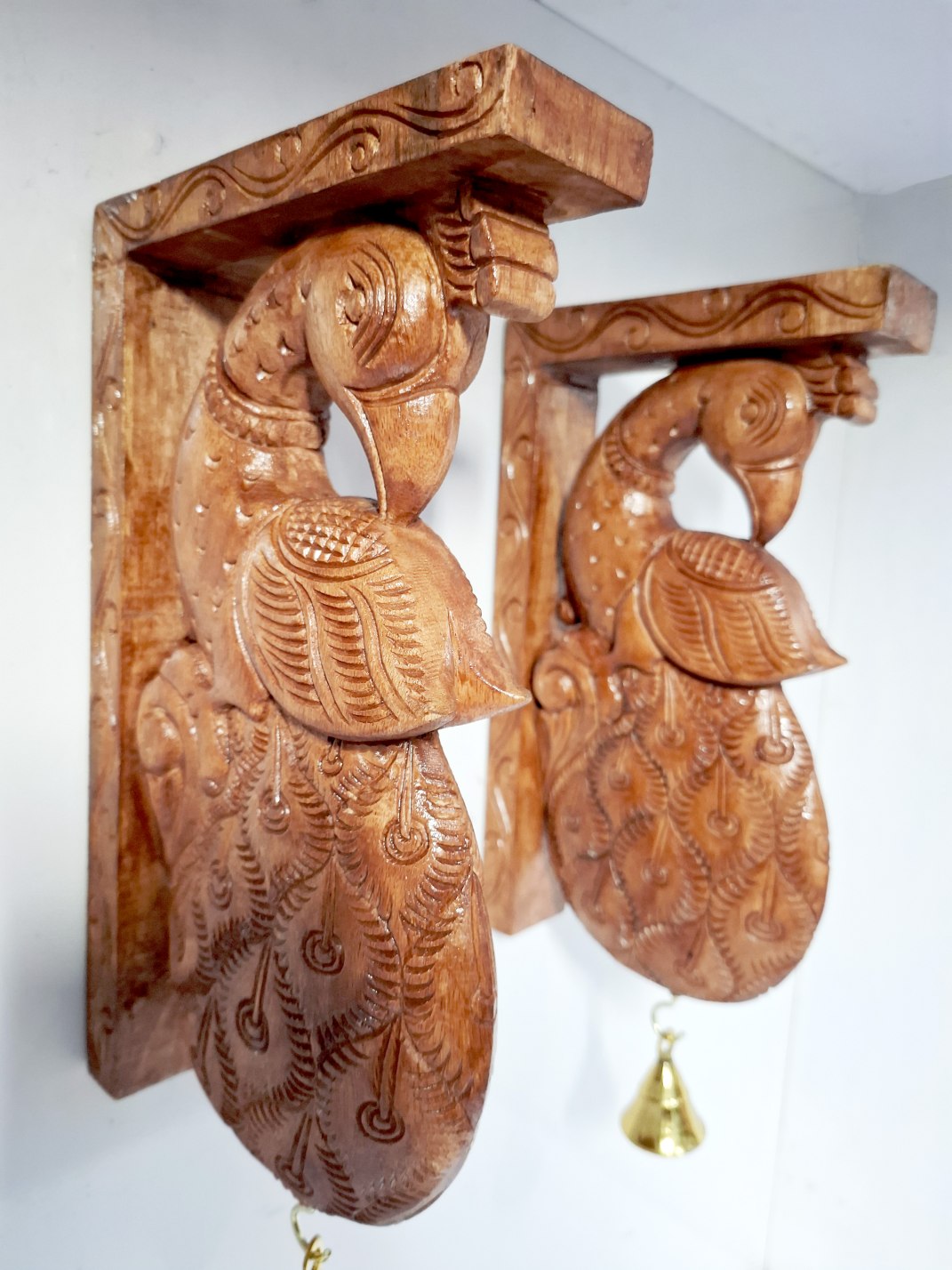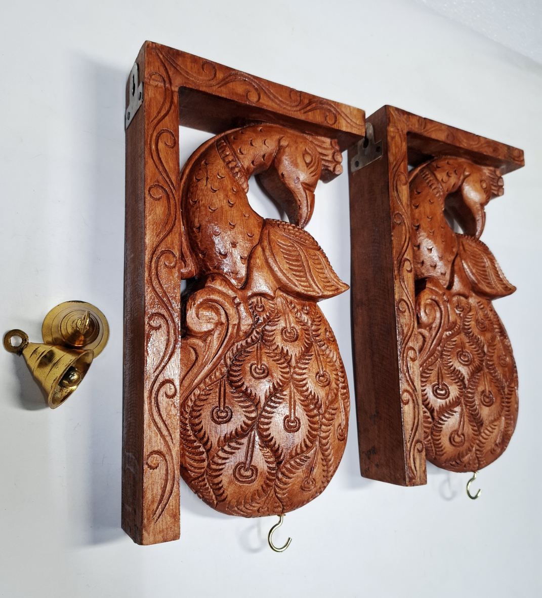 Enhance your home décor with this Wooden Peacock Wall Bracket Pair, crafted in solid wood with a rich brown finish and brass bells. Each 12-inch bracket is hand-carved with fine detailing, ideal for pooja rooms, entrances, and living spaces. A traditional design that adds heritage charm and elegance.