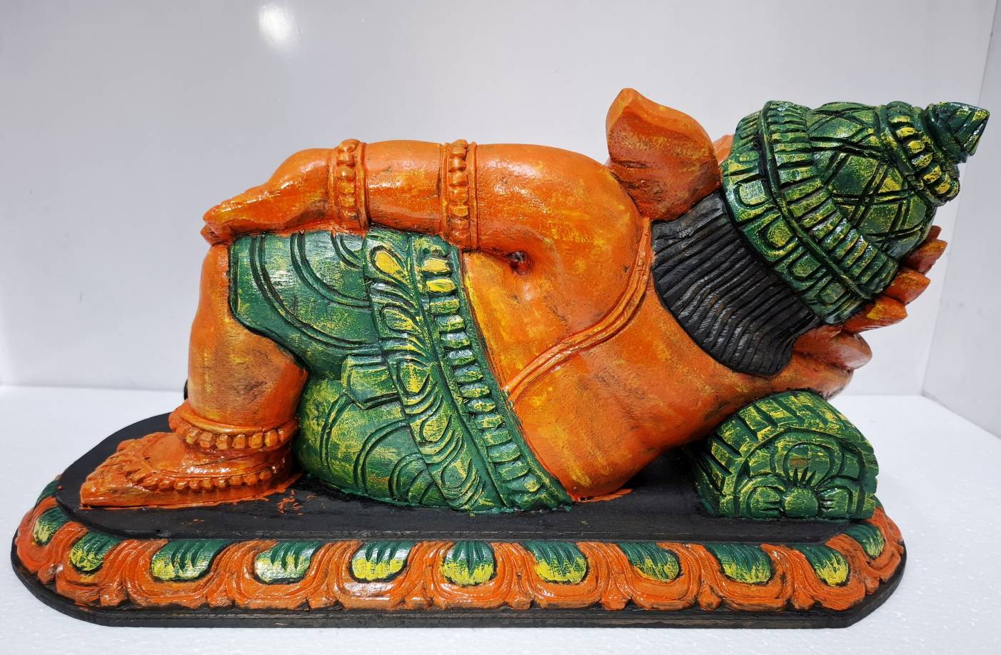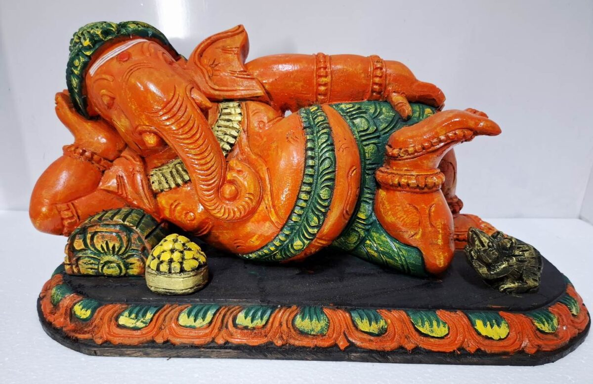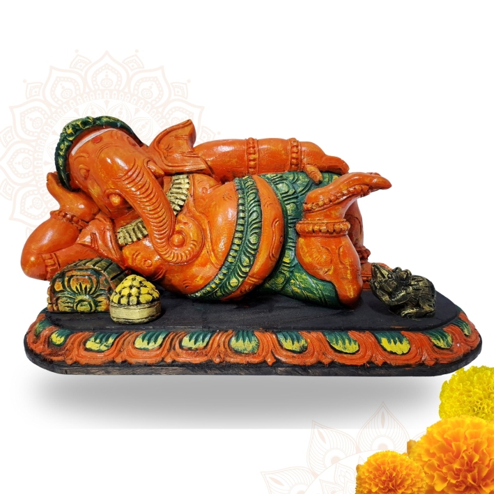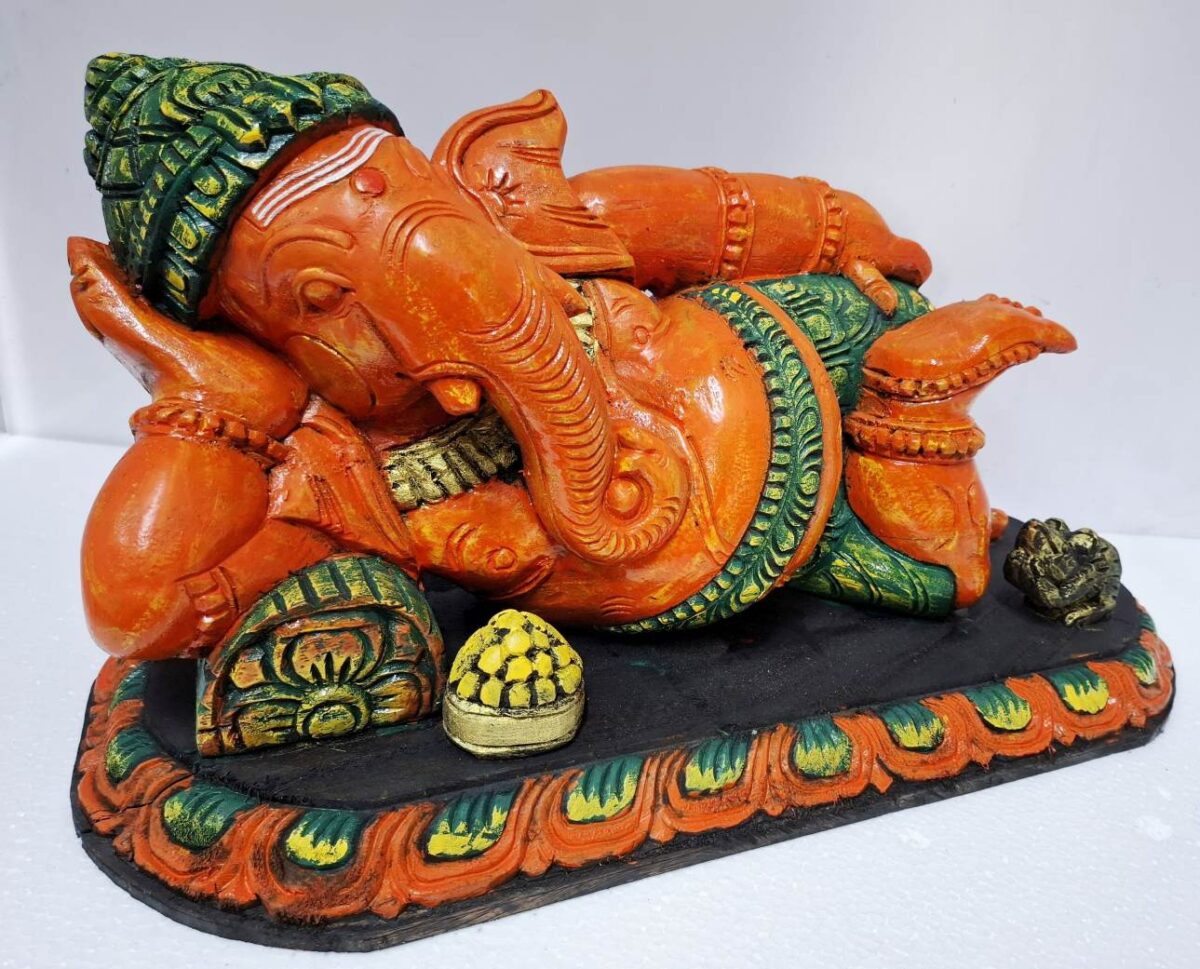 Handmade Craftsmanship – Reclining Lord Ganesha idol hand-carved from durable solid wood.