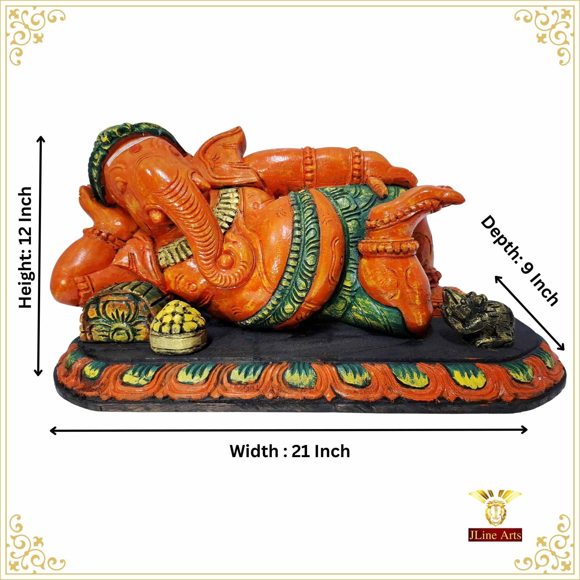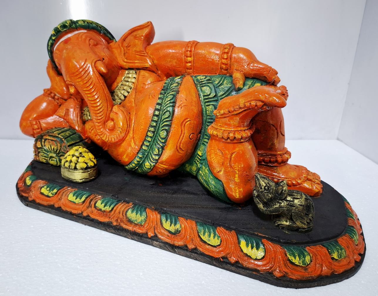 Magnificent 21-inch Wooden Reclining Ganesha Statue, hand-carved from solid wood with a rich multicolor finish.Represents Lord Ganesha in a resting pose, symbolizing prosperity, abundance, and luxury.Perfect centerpiece for temples, living rooms, offices, or as a thoughtful spiritual gift.