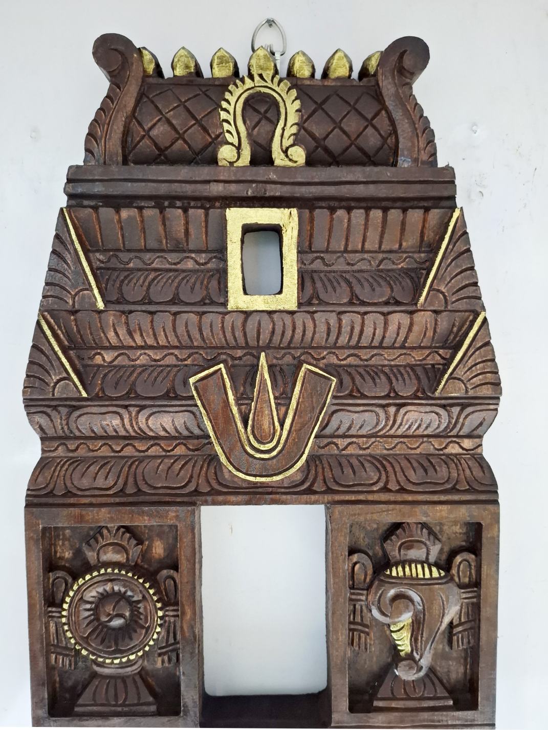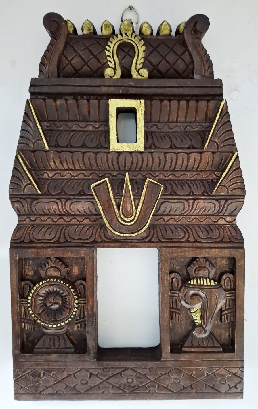 Artwork: Hand-carved solid wood South Indian temple Gopuram wall panel 18 inches with Shanku Chakra Namam symbols and gold accents, antique brown finish by JLine Arts