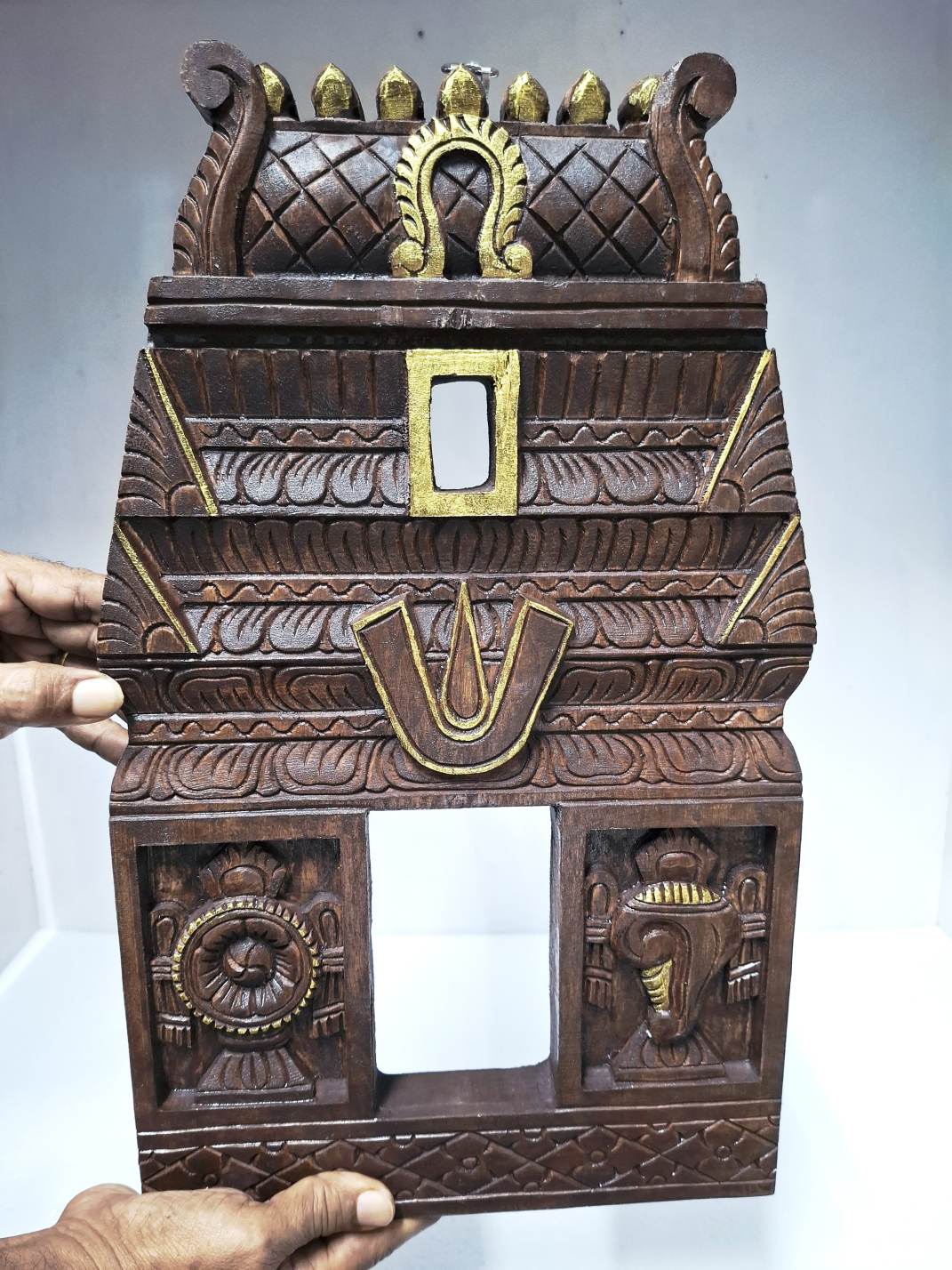 Authentic hand-carved solid wood Temple Gopuram wall panel featuring the sacred Vaishnava symbols — Shanku (conch), Chakra (wheel), and Namam (tilak) — inspired by traditional South Indian mandir architecture.