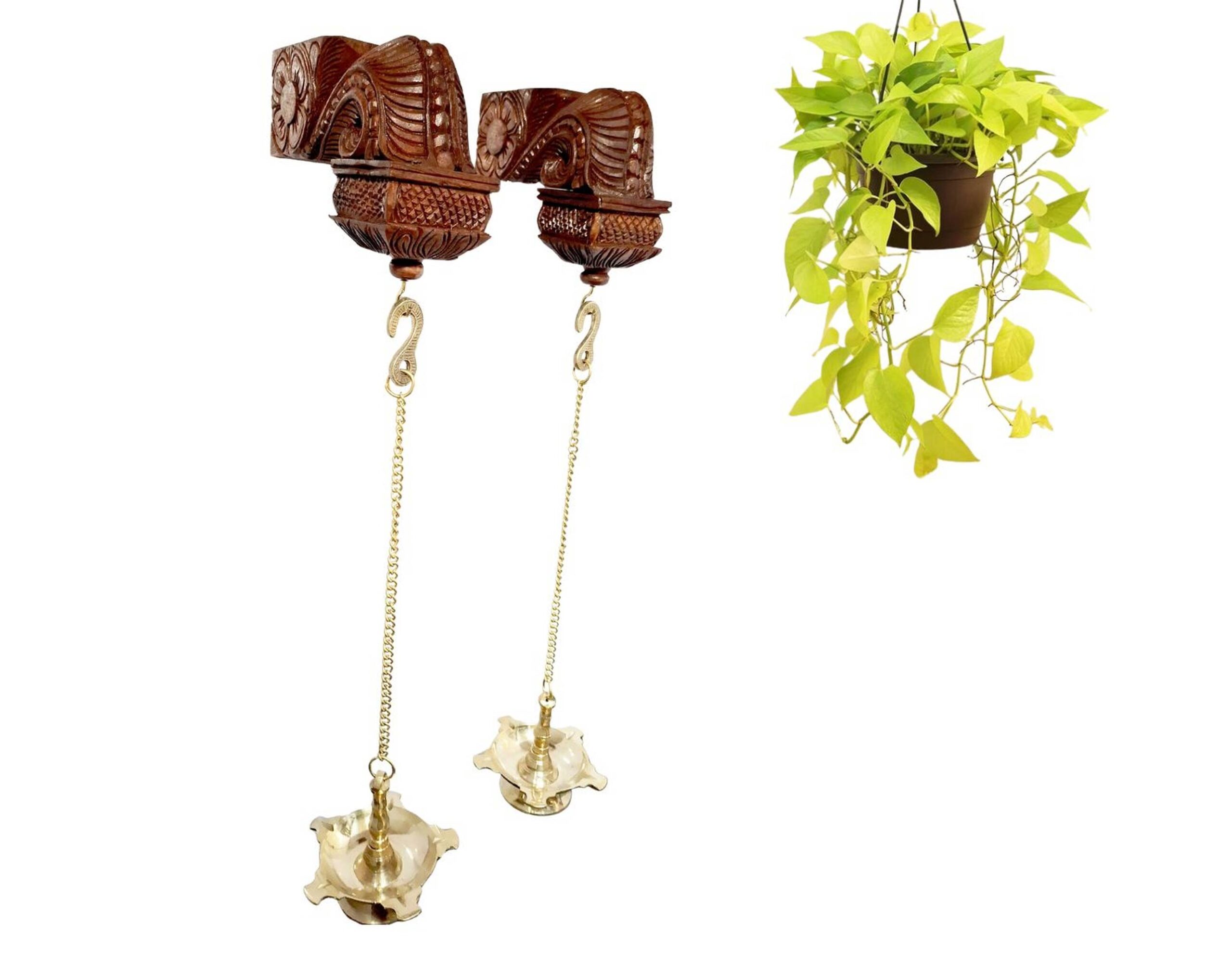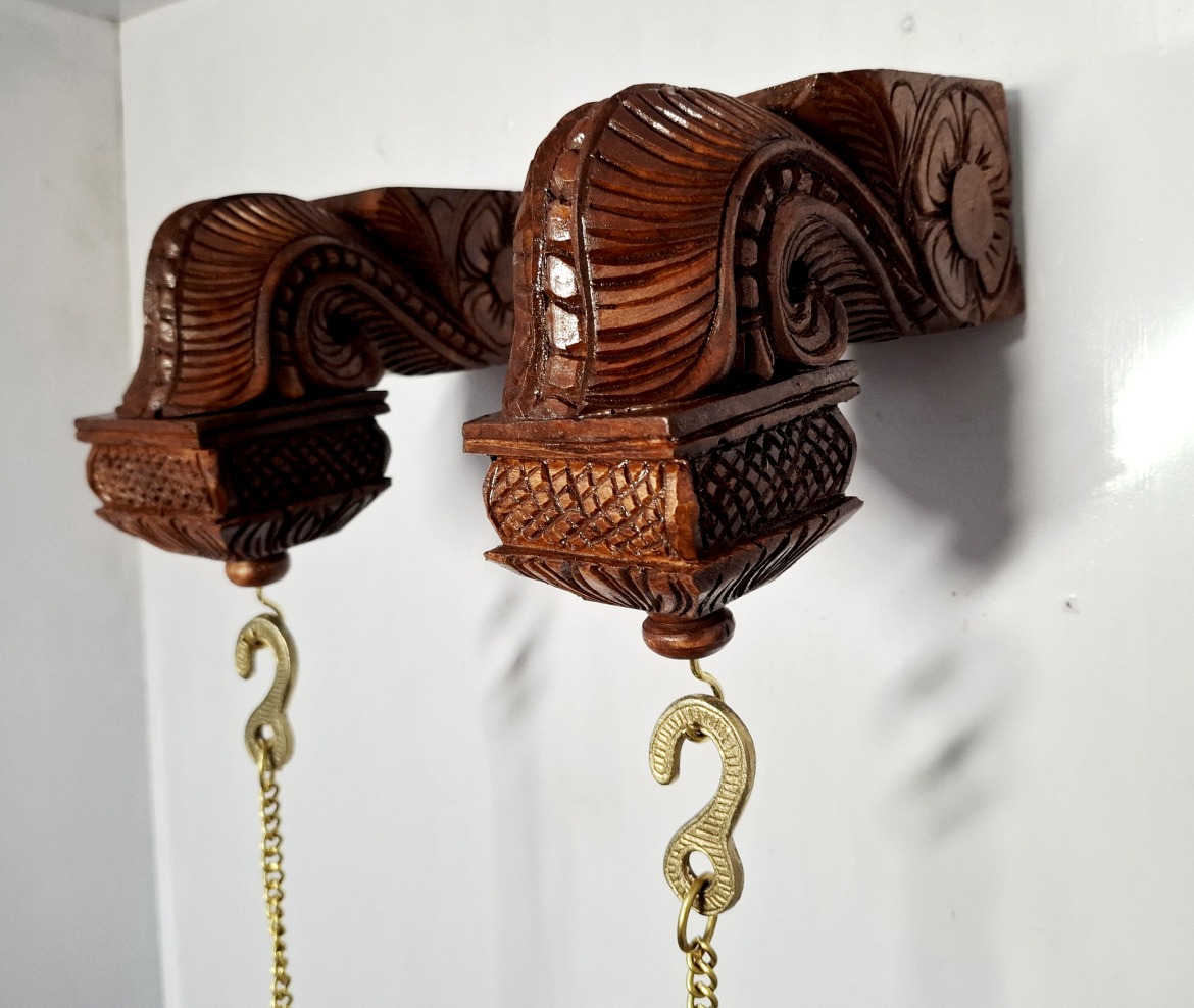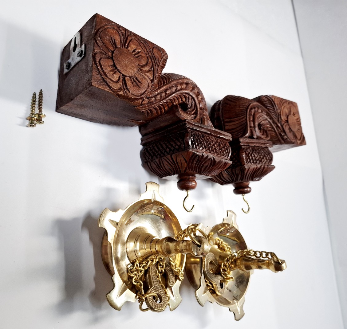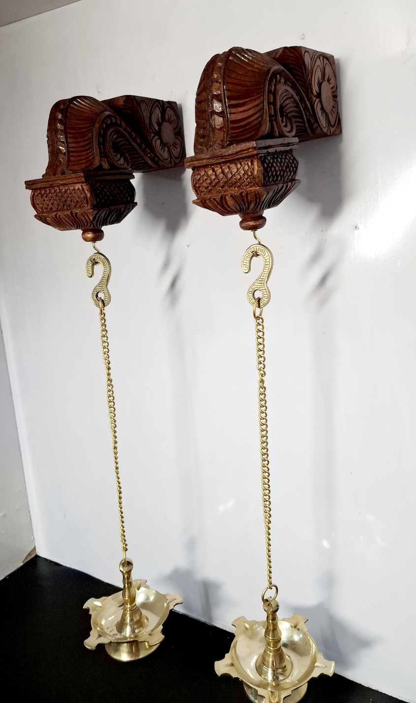Bodhil Wooden Wall Corbel Pair (2 Pcs) – Brown Finish with Brass Diya Lamps | Handmade Door Entrance Bracket | Hanging Décor | Ready to Ship