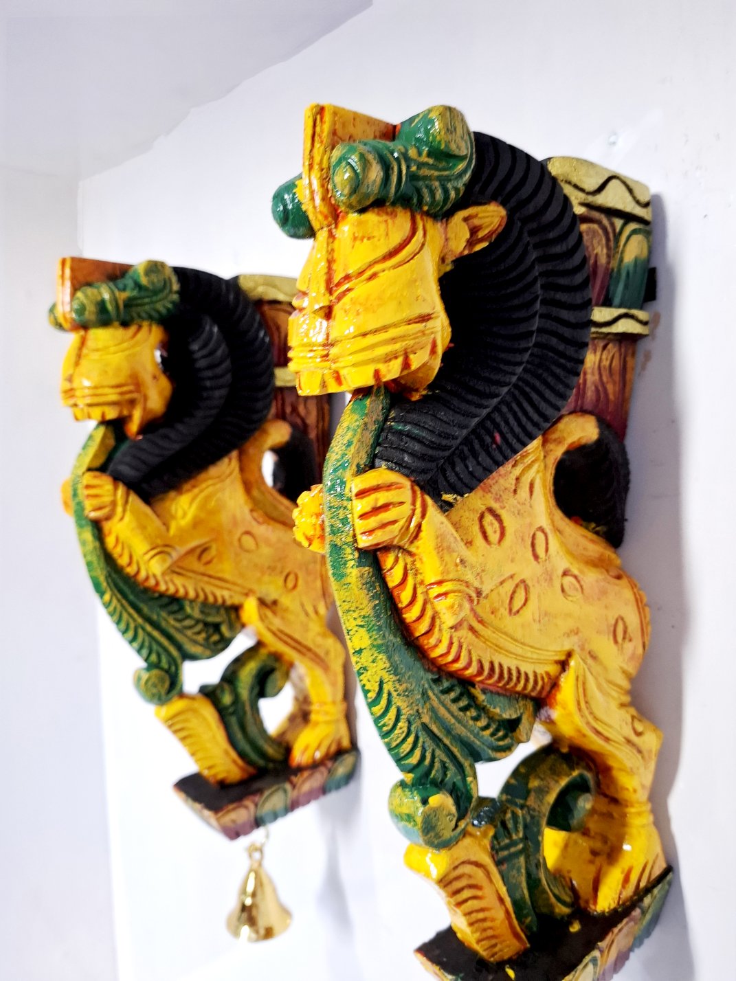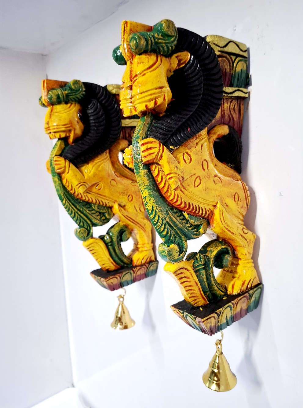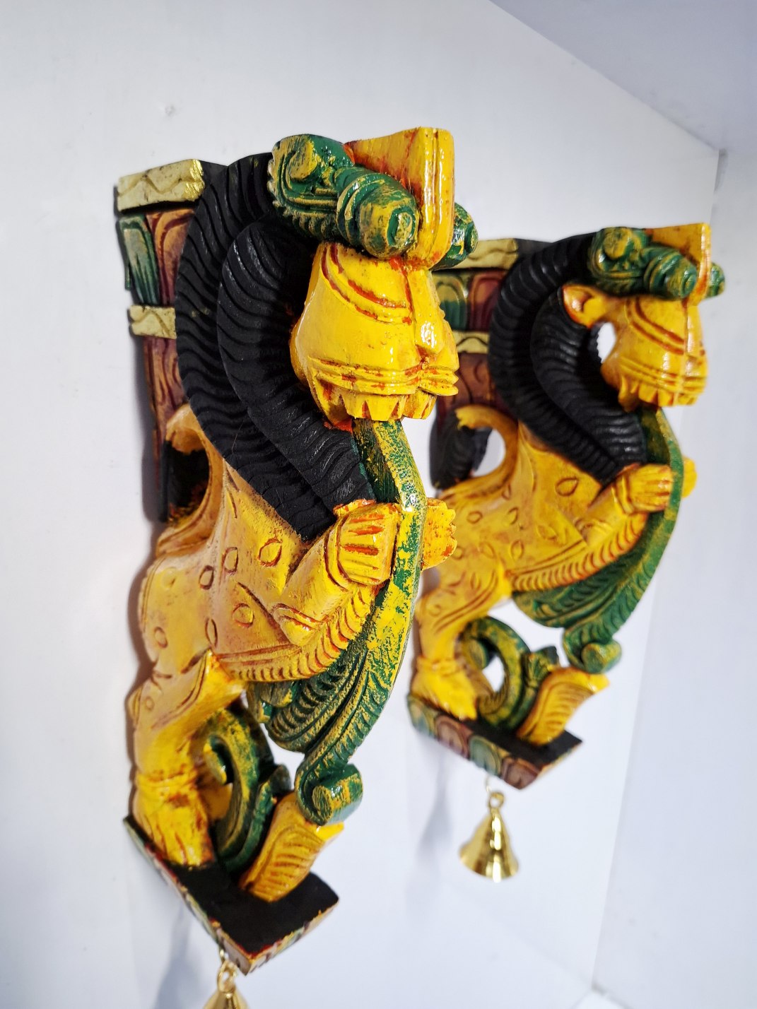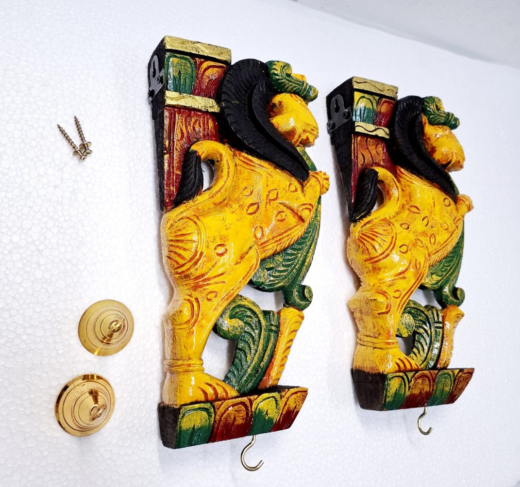 Traditional Wooden Yali (Yazhi) Wall Corbel Pair (12 Inch), hand-carved from solid wood with color finish.Fitted with brass bells for authentic South Indian temple-style décor.Perfect for pooja rooms, entrances, and ethnic home interiors.