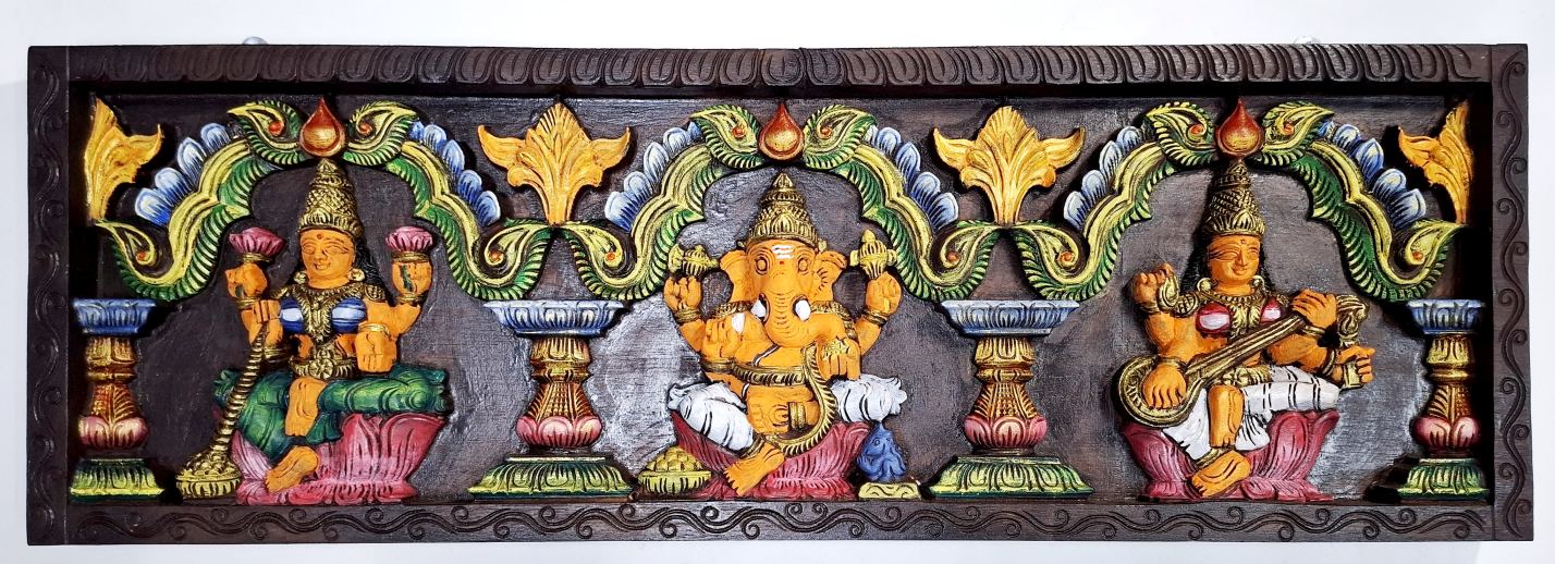 Lakshmi Ganesha Saraswathi Wall Panel 36 Inch | Hand-Carved Multicolor Wooden Art Original price was: $408.67.$347.01Current price is: $347.01.