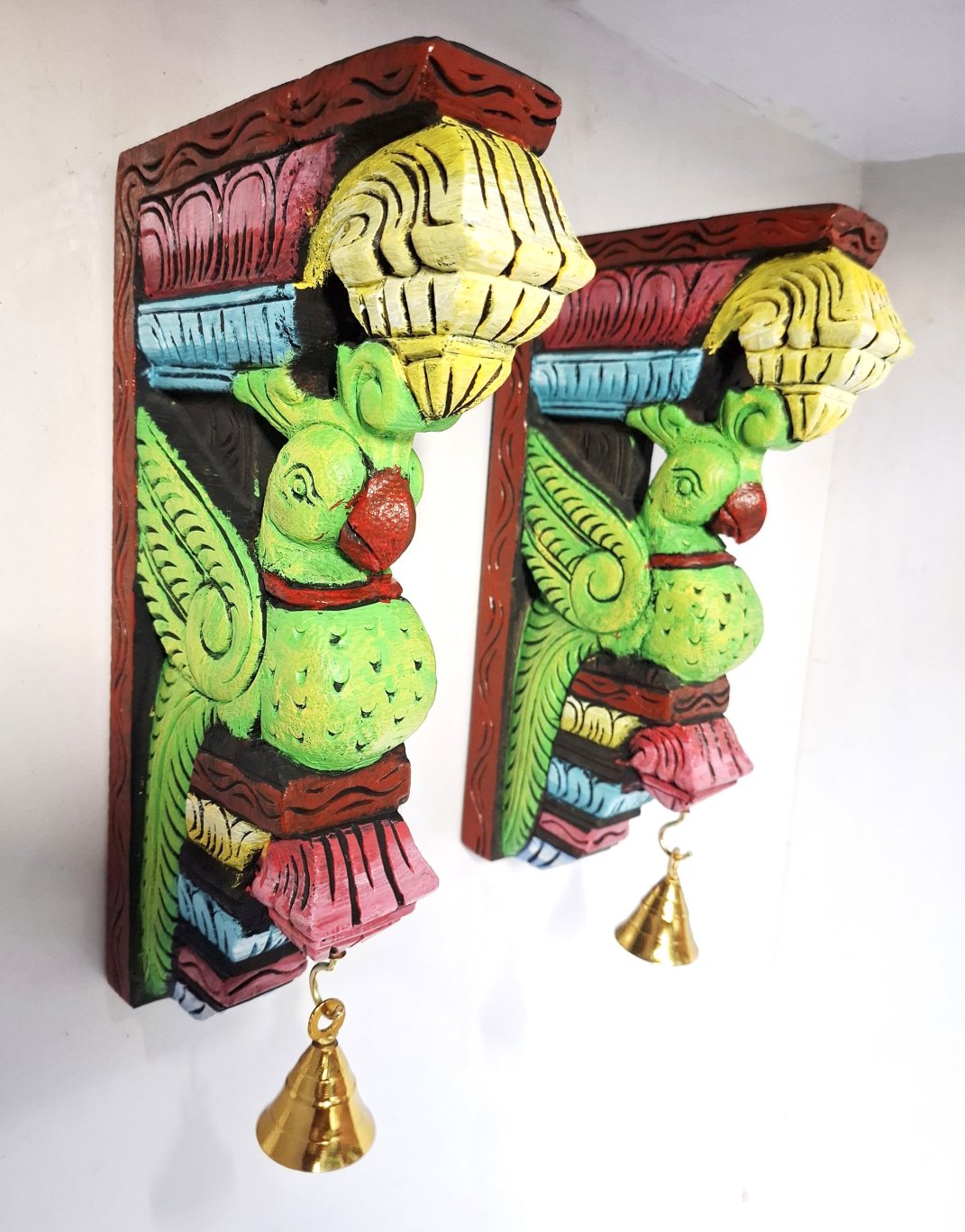 Wooden Wall Bracket Parrot Pair 12 Inch | Hand-Carved Multicolor Bird Corbels with Brass Bells Original price was: 145.00$.Current price is: 123.00$.